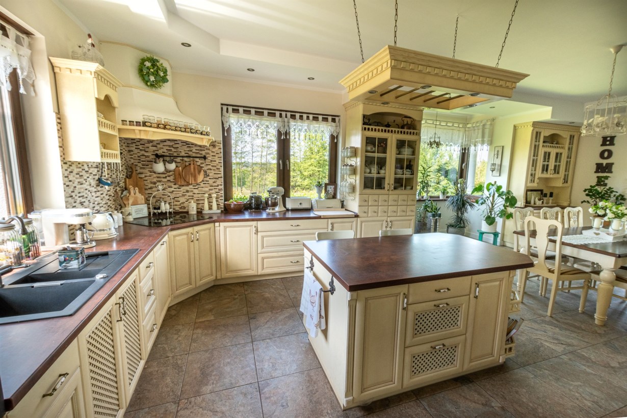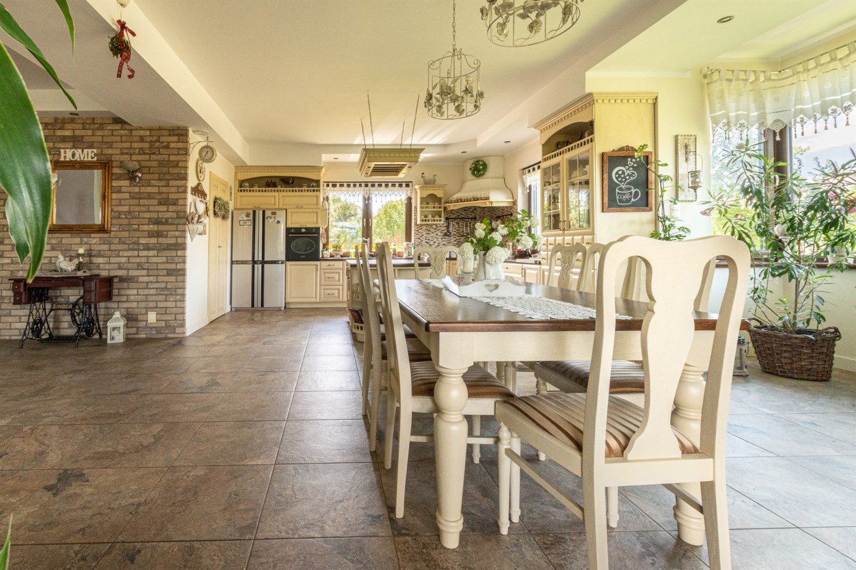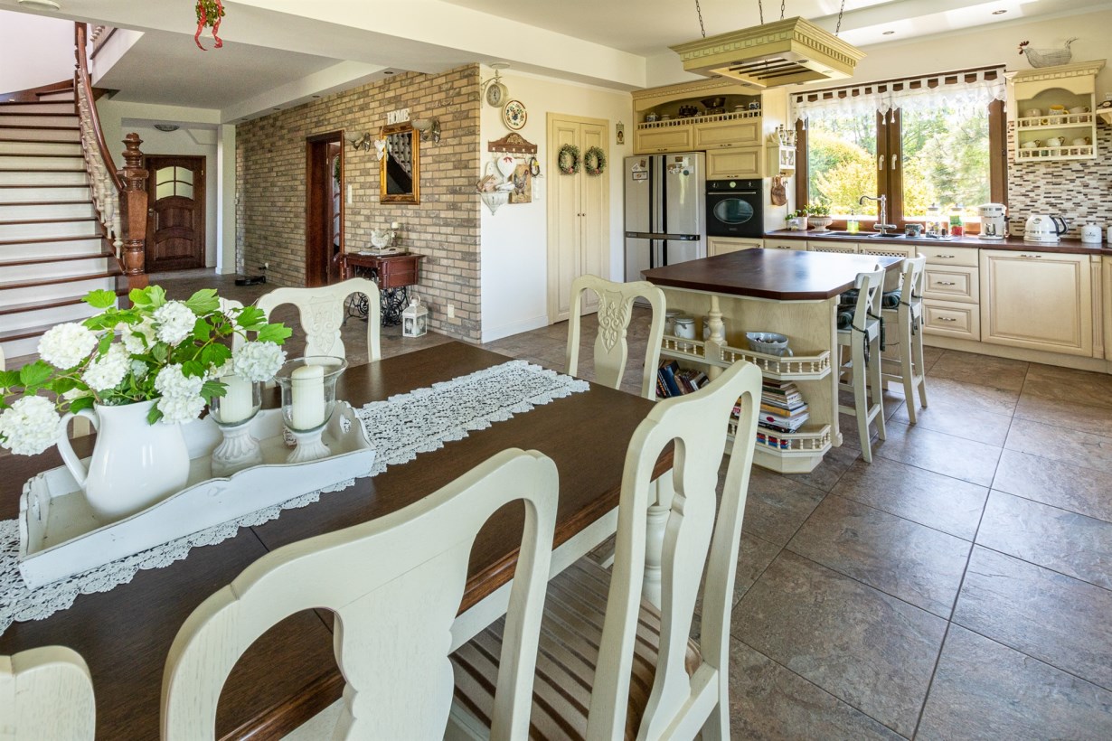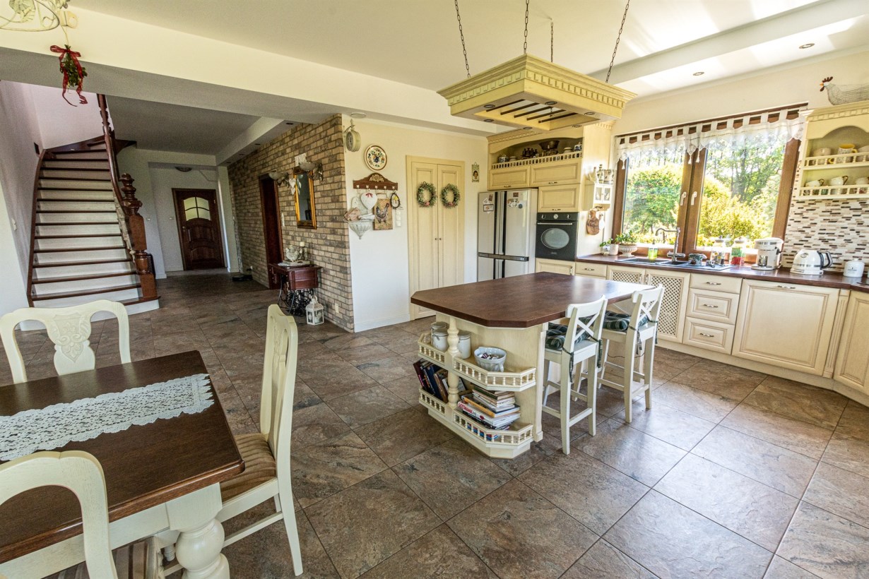 - otwarta kuchnia połączona z jadalnią o powierzchni 44 m2 - na podłodze gres, do dyspozycji klimatyczna drewniana kuchnia wraz ze sprzętami agd, z jadalni widok na ogród, dodatkowo wyjście na przestronny taras, przy kuchni wygospodarowano spiżarnię,