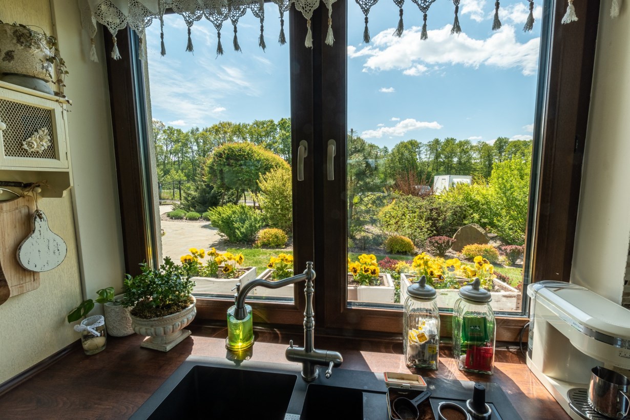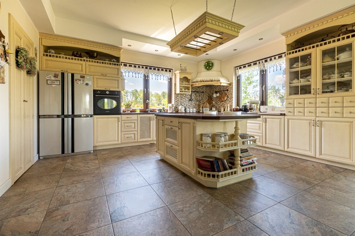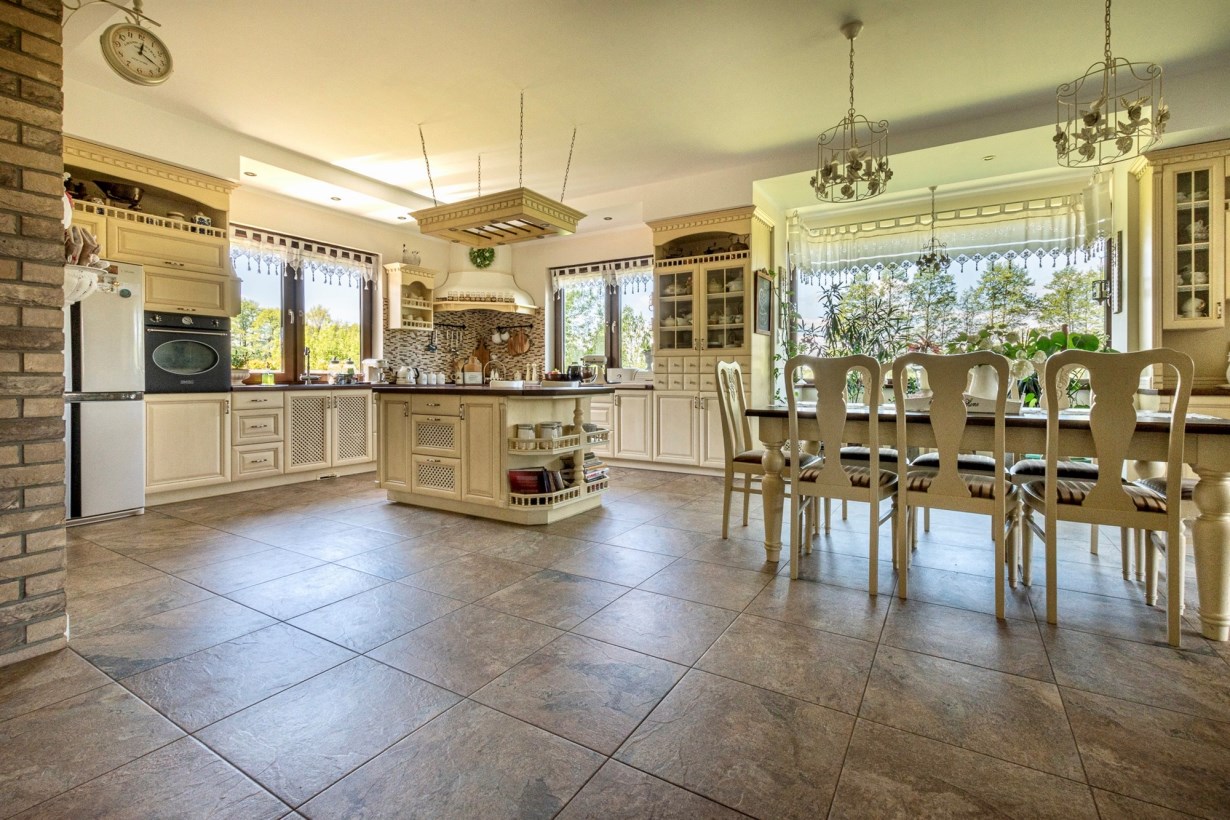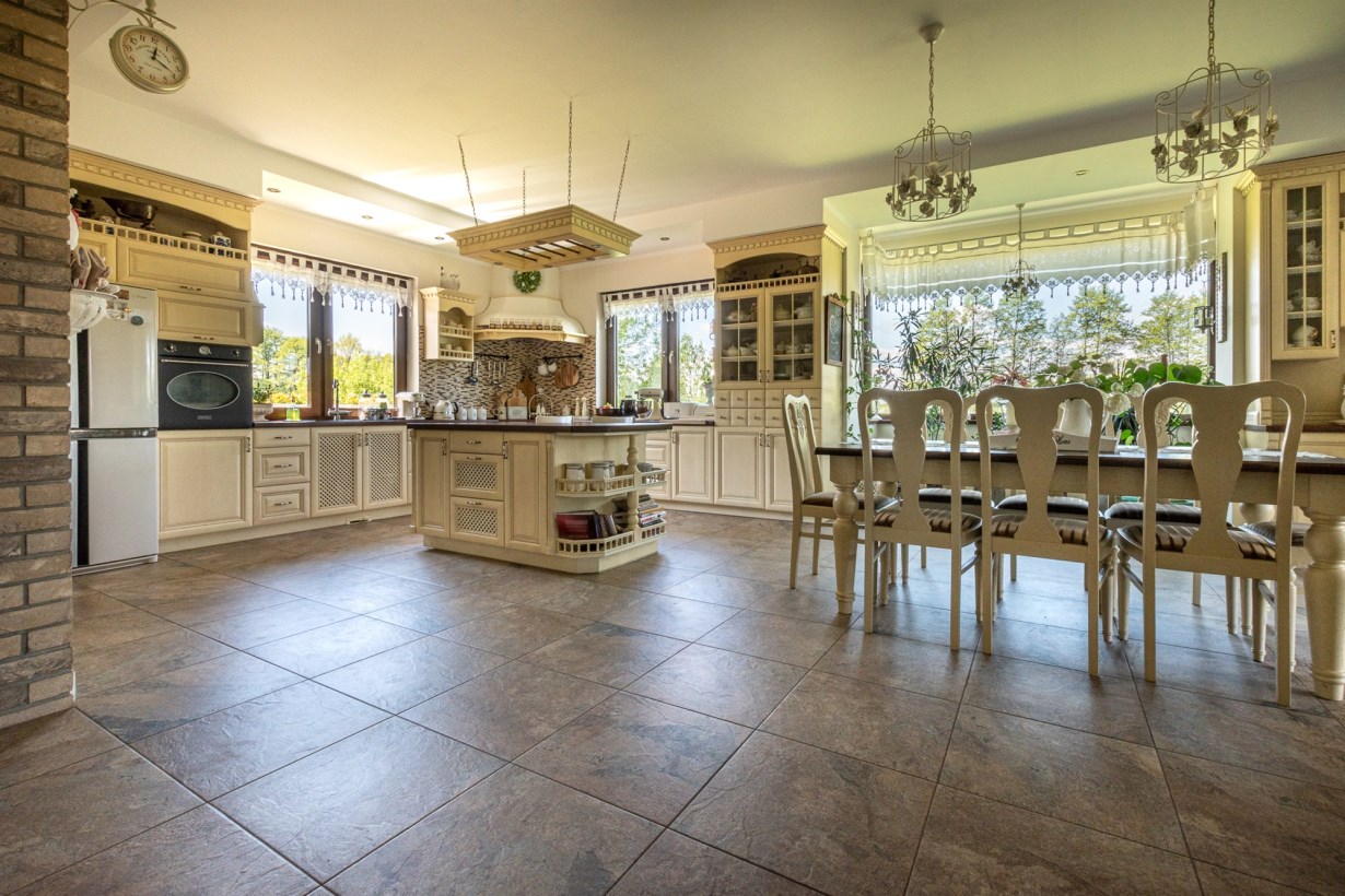 - otwarta kuchnia połączona z jadalnią o powierzchni 44 m2 - na podłodze gres, do dyspozycji klimatyczna drewniana kuchnia wraz ze sprzętami agd, z jadalni widok na ogród, dodatkowo wyjście na przestronny taras, przy kuchni wygospodarowano spiżarnię,