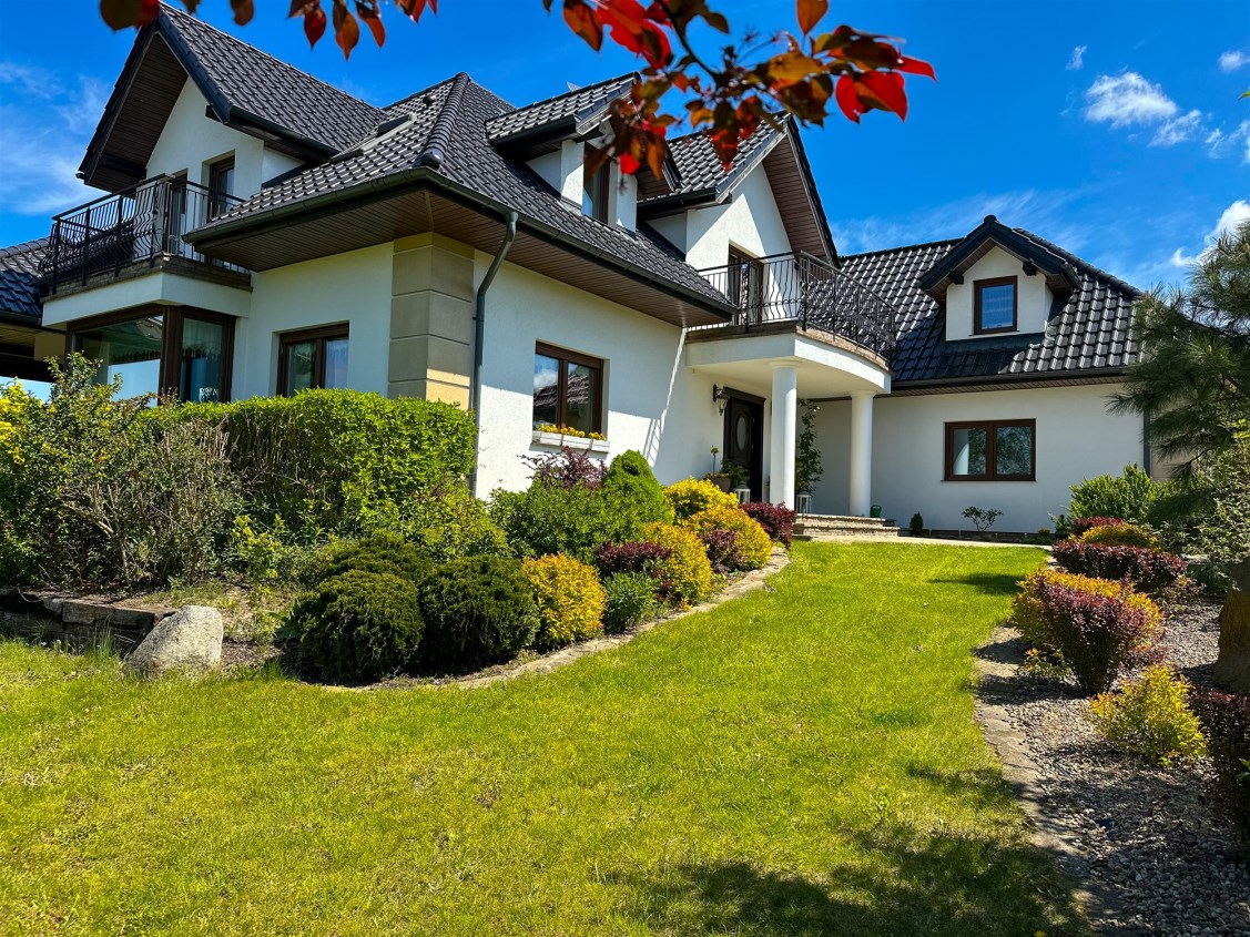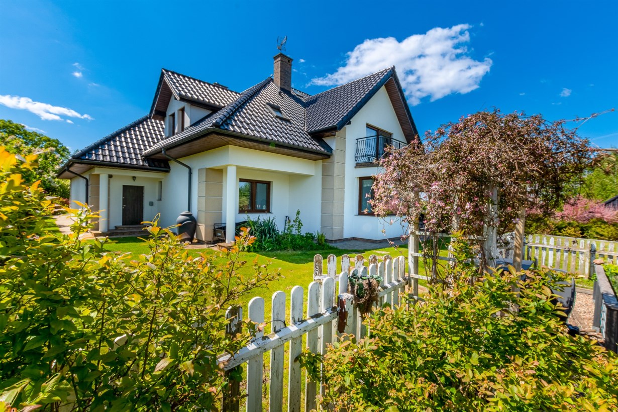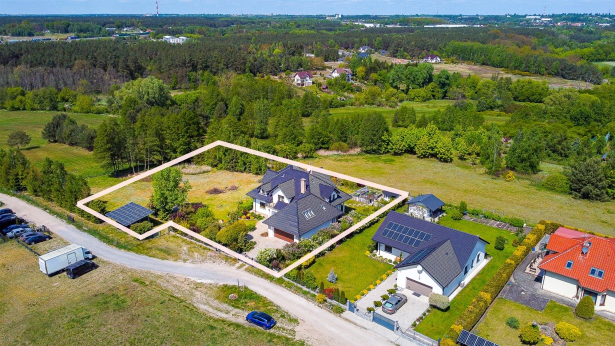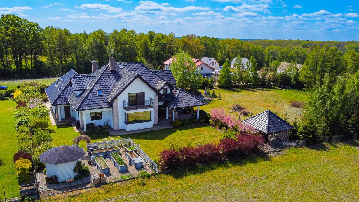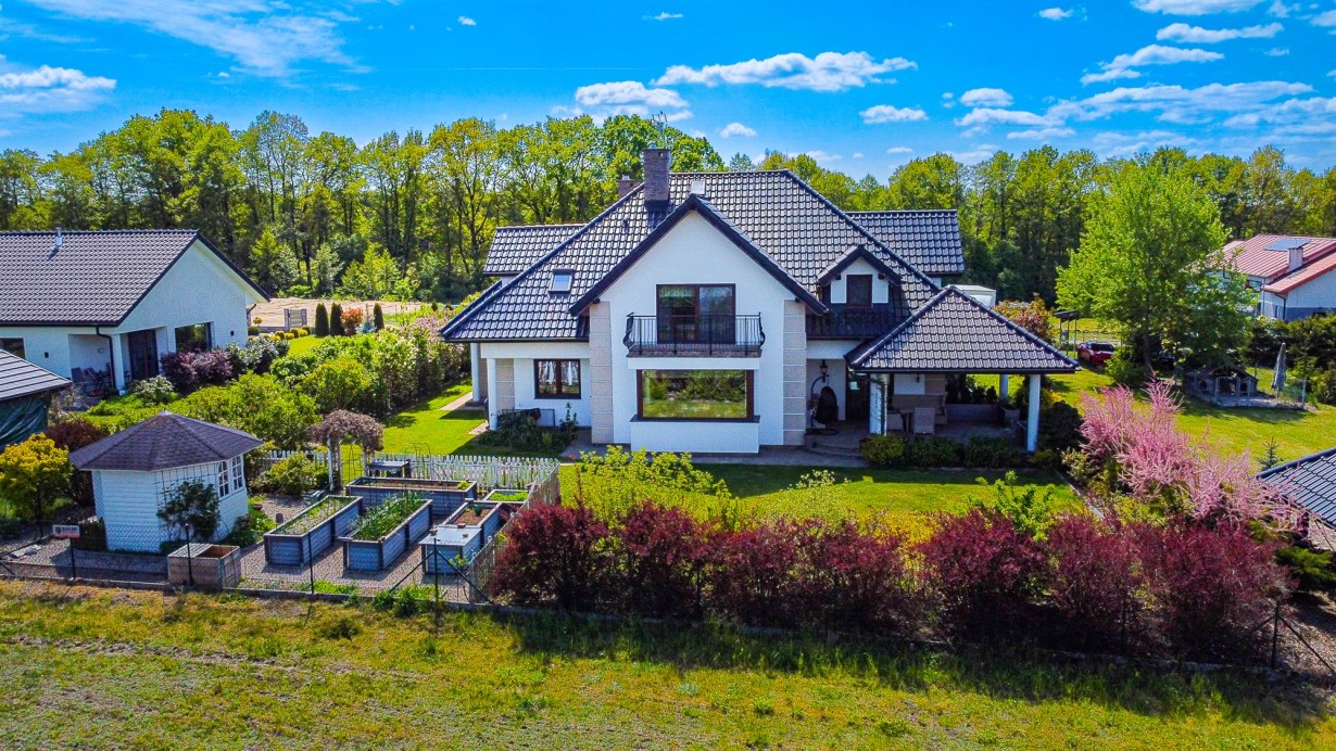 Dom wolnostojący, z dwoma kondygnacjami nadziemnymi, wybudowany w 2014 roku w cichym i spokojnym miejscu. Działka o łącznej powierzchni 3711 m2 uzbrojona jest w sieć elektroenergetyczną, wodociągową (oprócz wodociągu gminnego dodatkowo własne ujęcie wody) oraz kanalizacyjną. Na działce fotowoltaika. Dom ogrzewany pompą ciepła. Rekuperacja. Ogród zagospodarowany z rozprowadzonym nawodnieniem - m.in. wydzielone miejsce zadzaszone pod grilla, warzywniak, wiata na garażowanie dodatkowych aut.