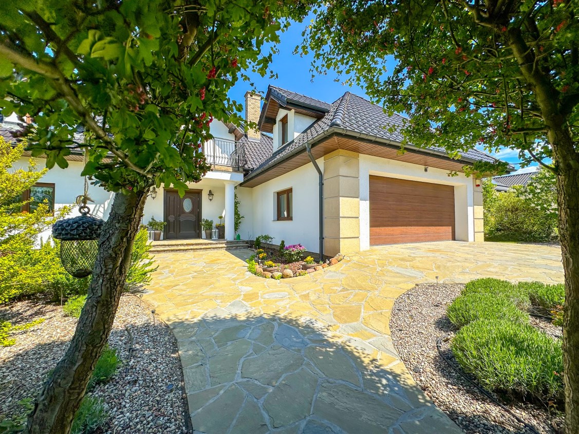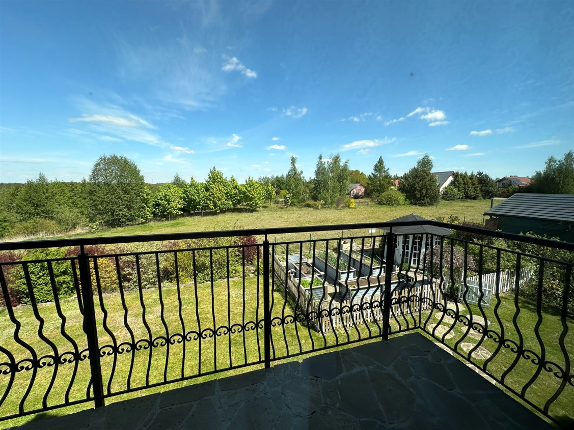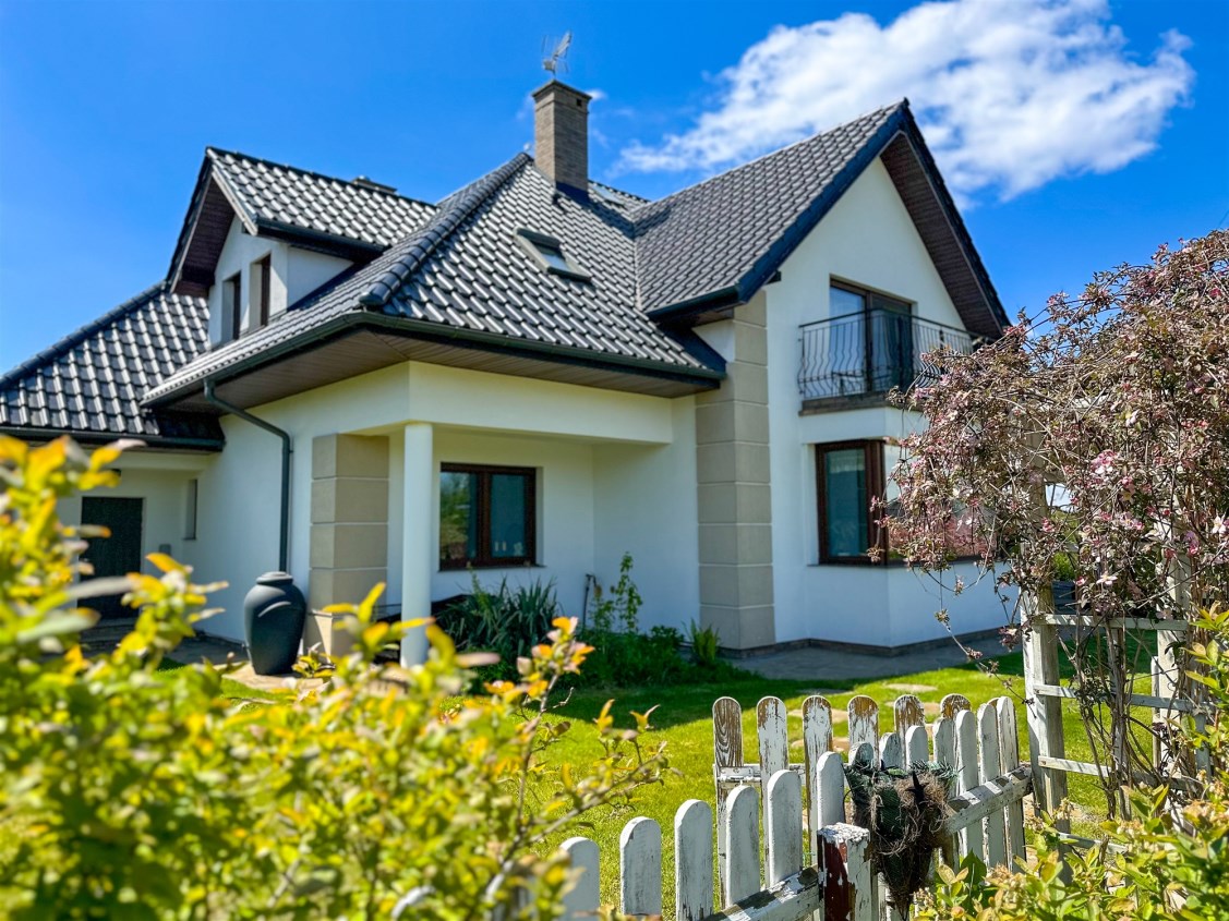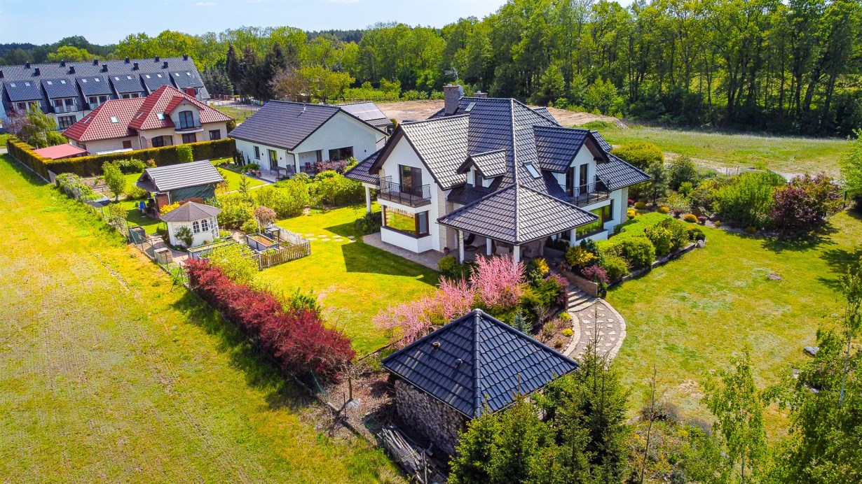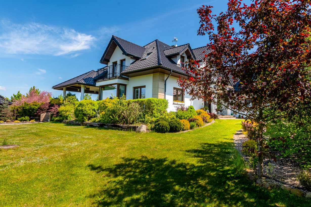 Dom wolnostojący, z dwoma kondygnacjami nadziemnymi, wybudowany w 2014 roku w cichym i spokojnym miejscu. Działka o łącznej powierzchni 3711 m2 uzbrojona jest w sieć elektroenergetyczną, wodociągową (oprócz wodociągu gminnego dodatkowo własne ujęcie wody) oraz kanalizacyjną. Na działce fotowoltaika. Dom ogrzewany pompą ciepła. Rekuperacja. Ogród zagospodarowany z rozprowadzonym nawodnieniem - m.in. wydzielone miejsce zadzaszone pod grilla, warzywniak, wiata na garażowanie dodatkowych aut.