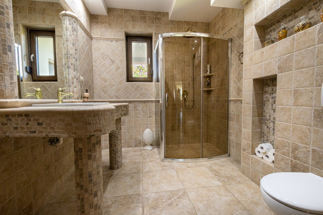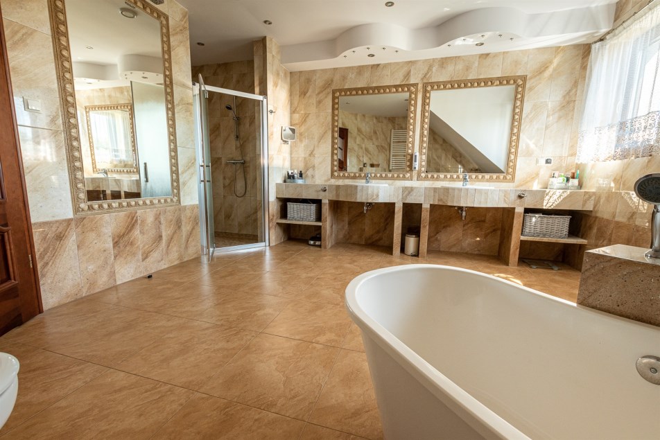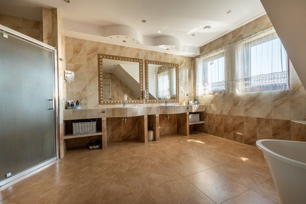 - przestronna łazienka połączona z wc - pow. 16,50 m2, na wyposażeniu dwie umywalki, lustra, prysznic, wanna, podwieszany sufit,