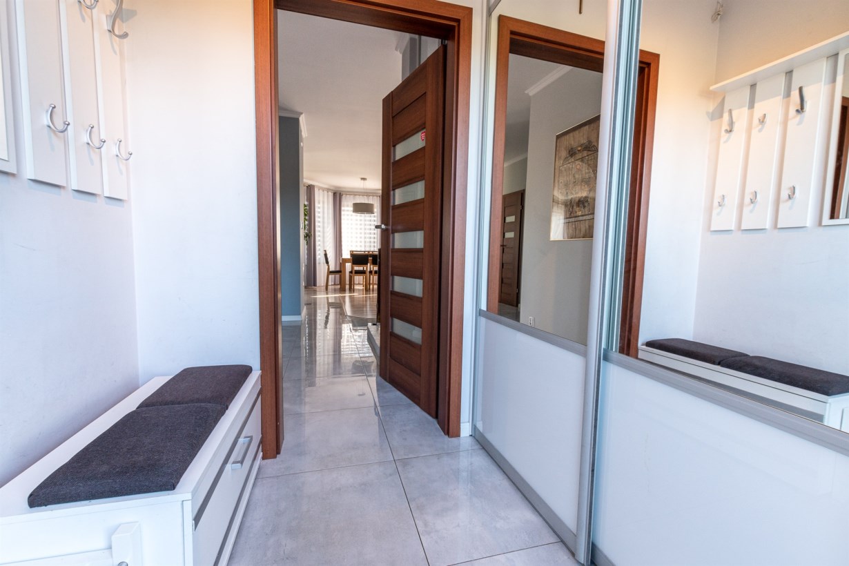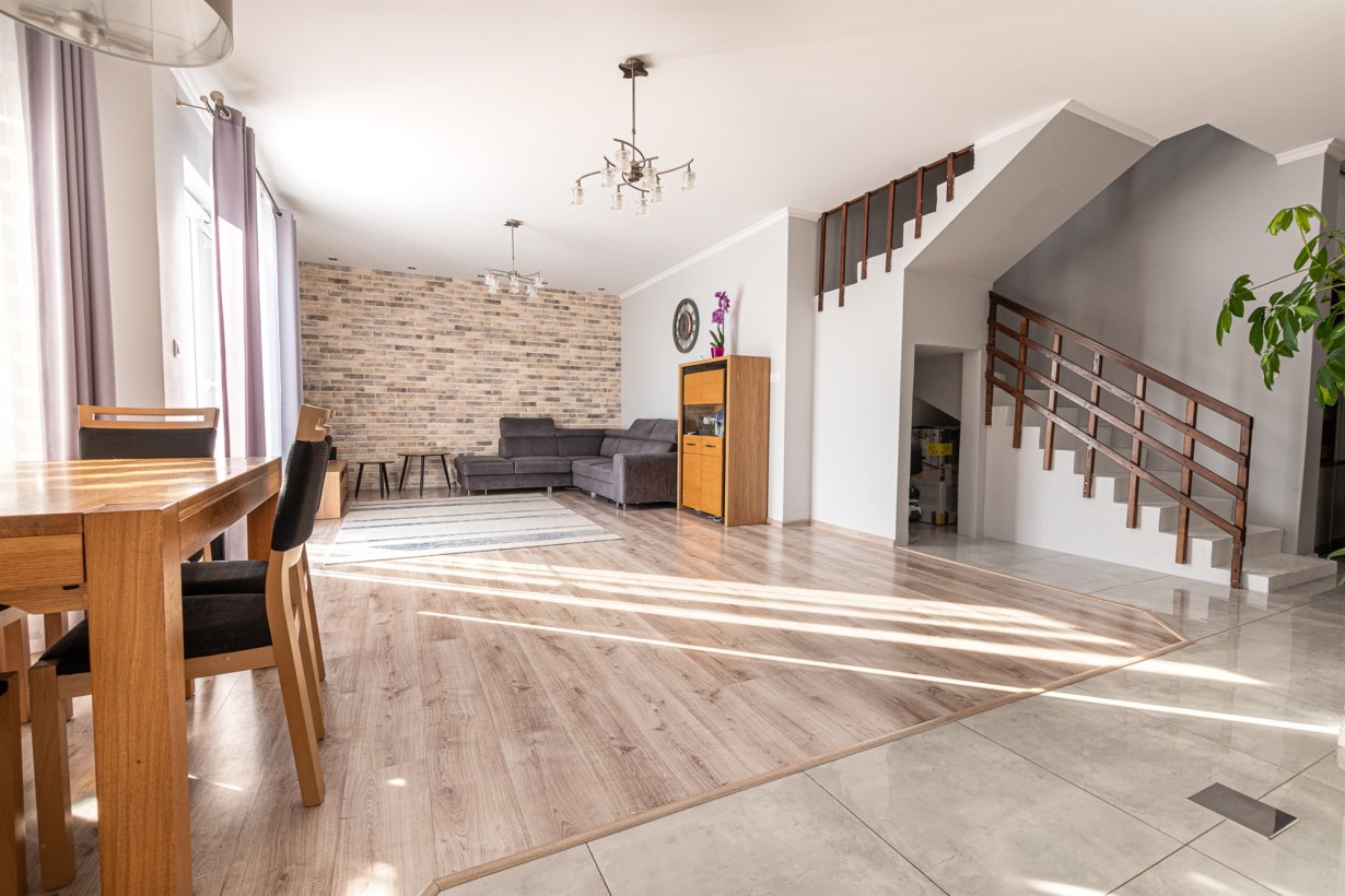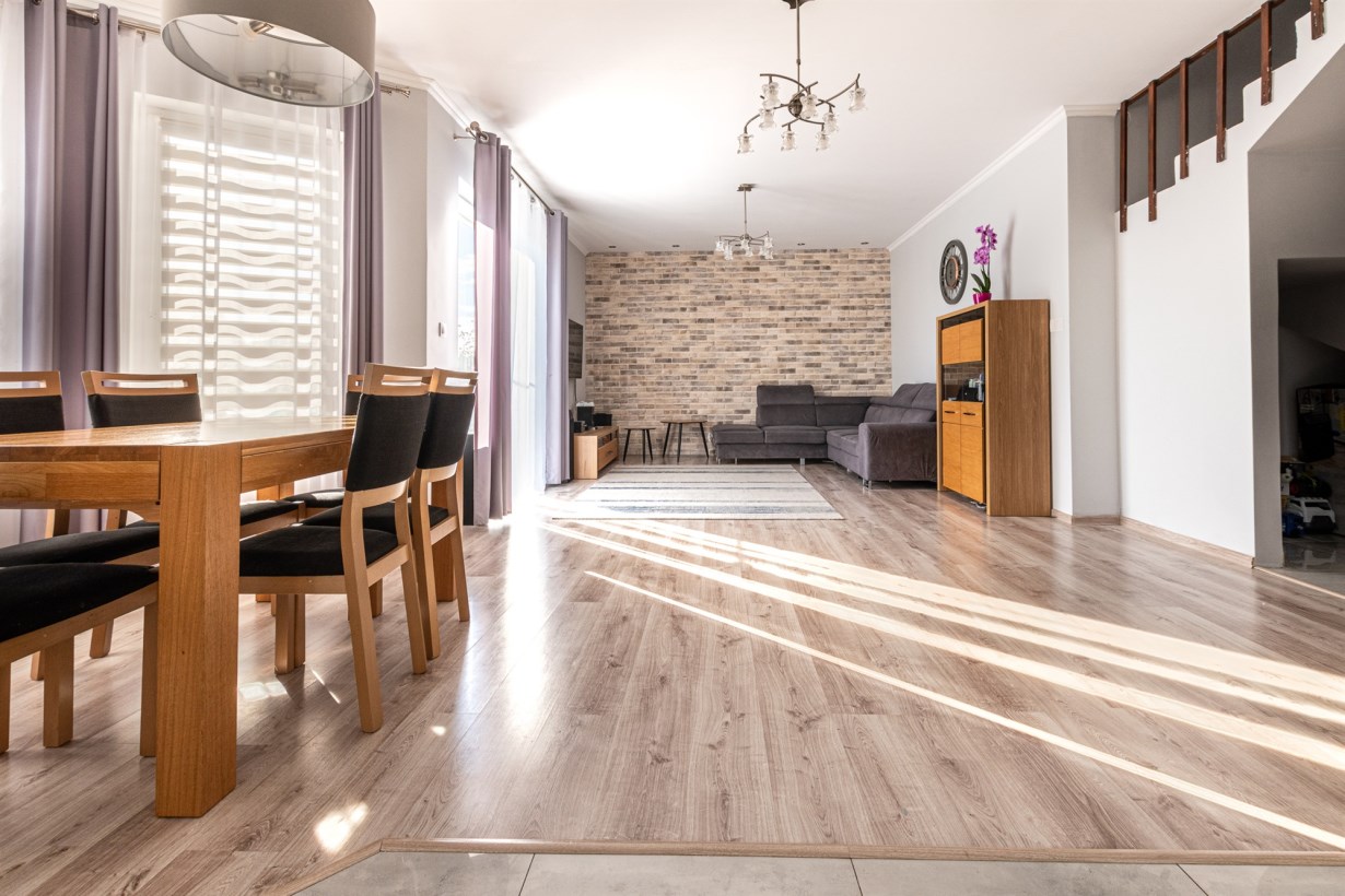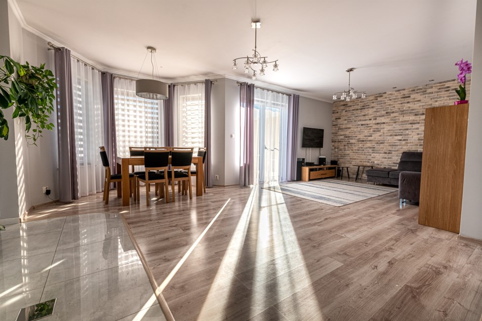 Na podłogach w salonie i gabinecie znajdują się wysokiej jakości panele, w pozostałych pomieszczeniach płytki podłogowe. Ściany wykończone są gładzią w jasnych, ponadczasowych kolorach oraz ozdobną cegłą.