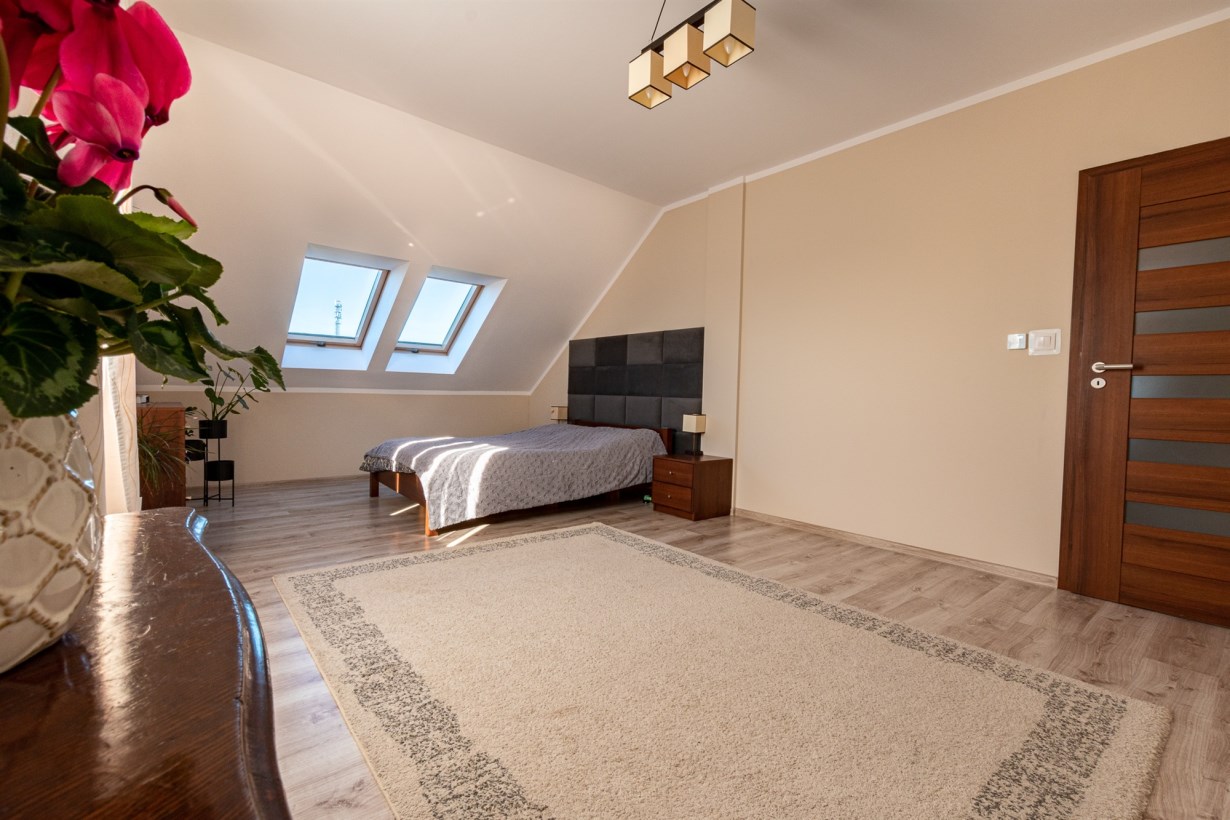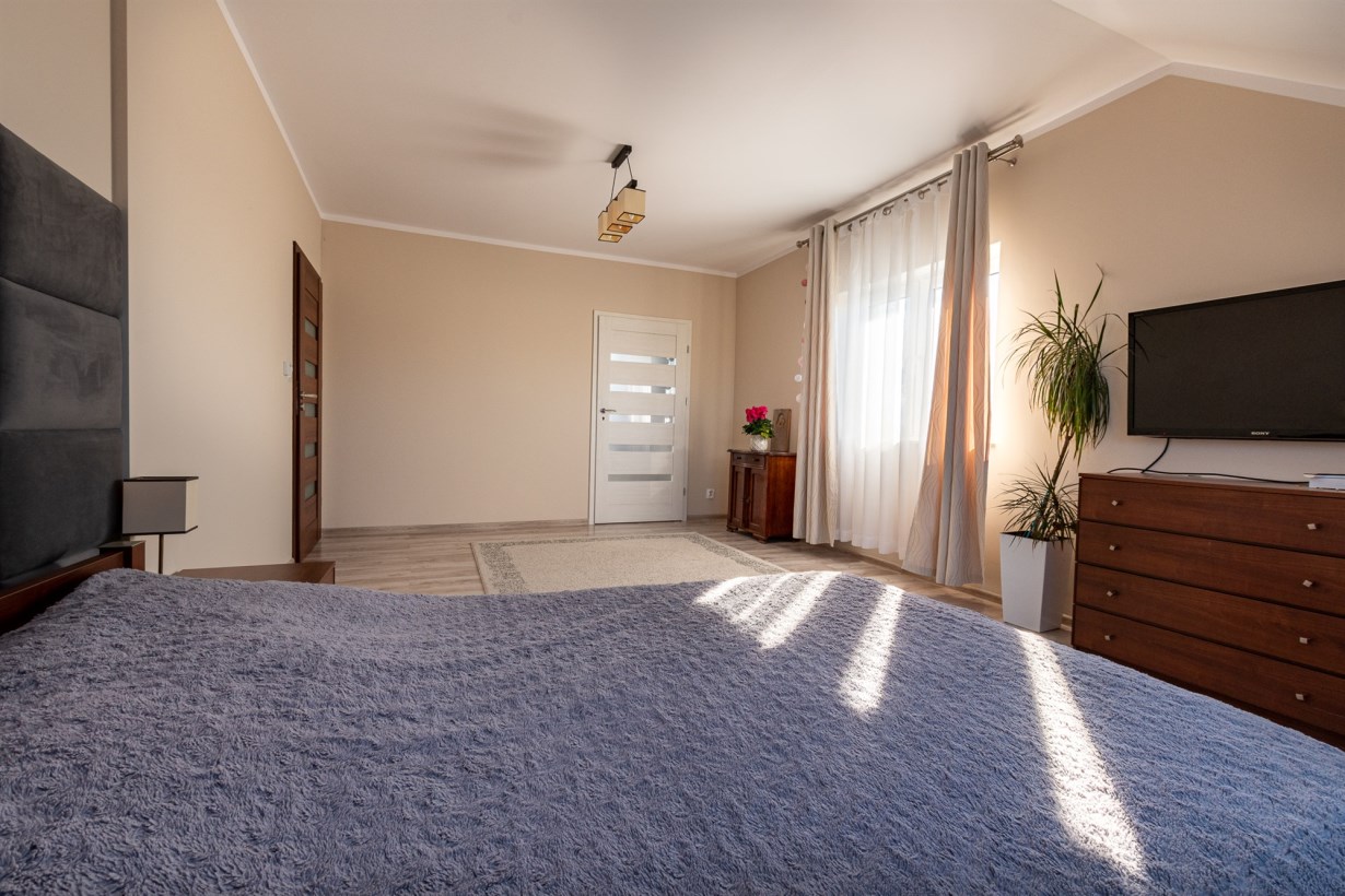 Piętro jest również bardzo funkcjonalnie zagospodarowane. Są 3 sypialnie, z czego dwie z nich mają swoje własne garderoby. Również balkony są dwa z wyjściami z dwóch sypialni.