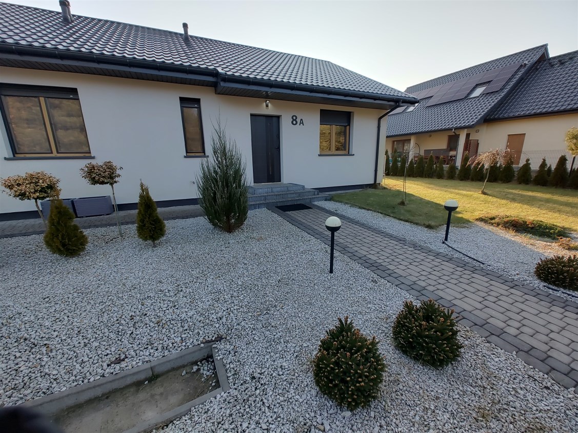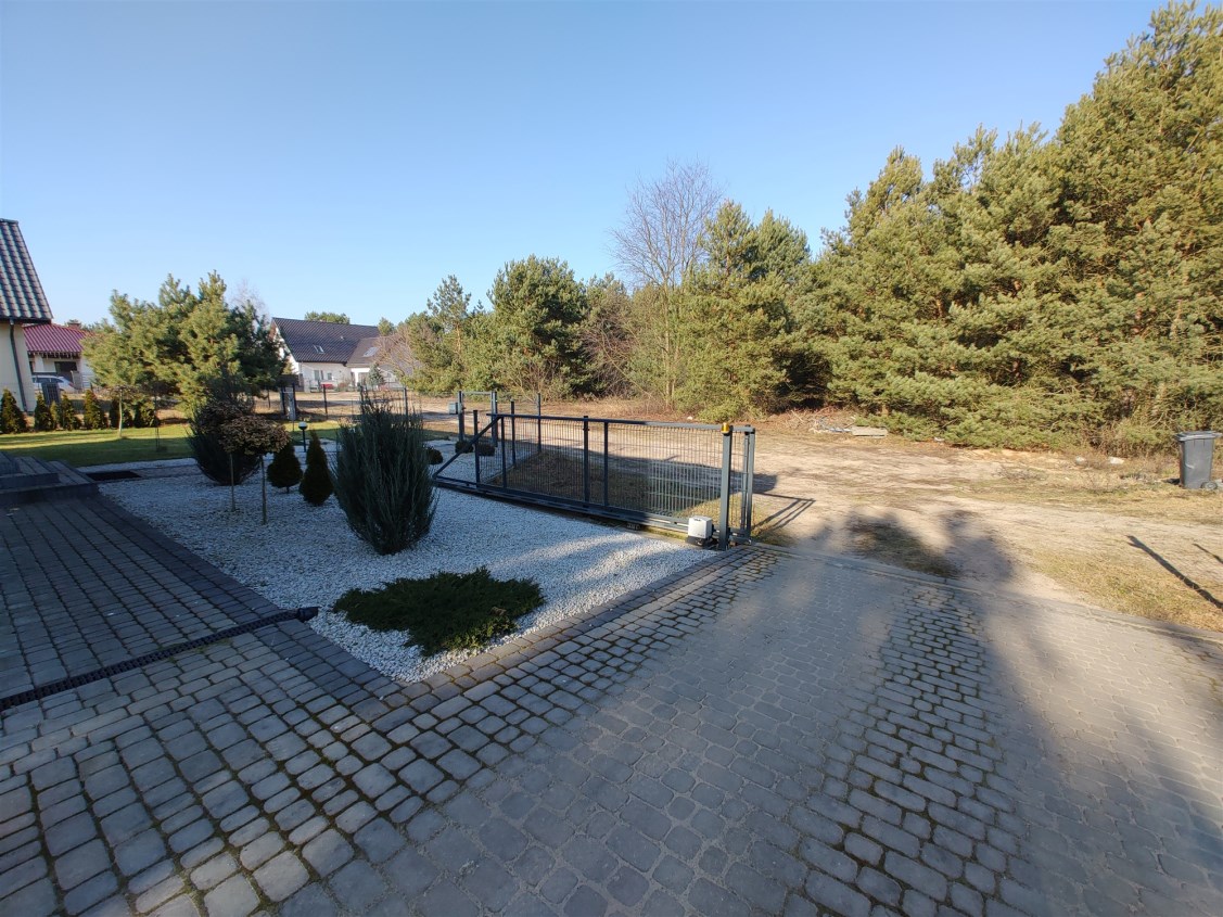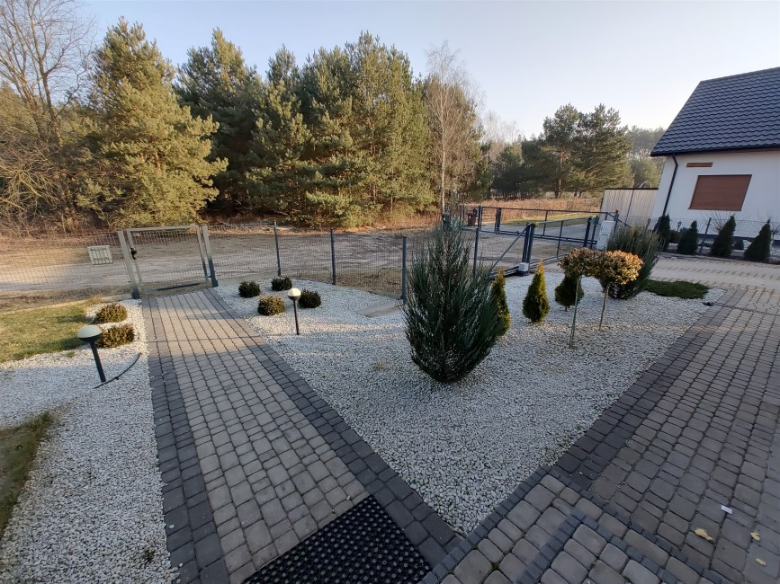 Otoczenie domu bardzo zadbane - brama wjazdowa szeroka, elektrycznie otwierana - teren przed domem wybrukowany kostką z elementami zieleni. Całość spójnie wykończona.