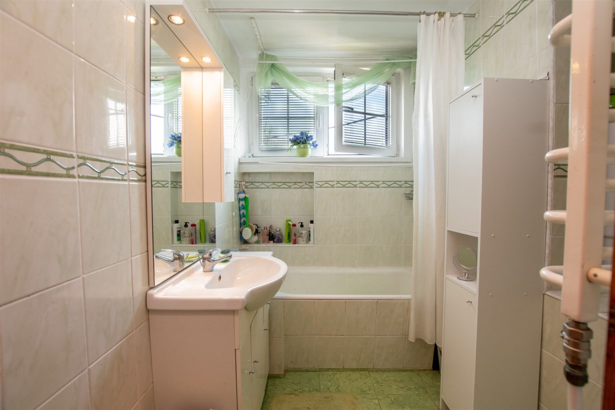 - łazienka z oknem i wnęką gdzie wstawiona jest pralka.
