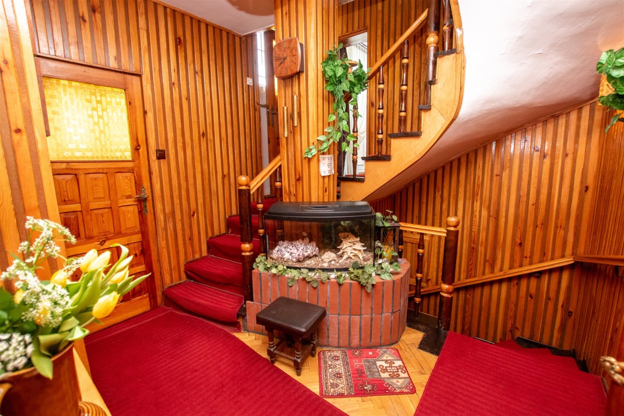 Ponadto w bryle budynku garaż jednostanowiskowy. Wjazd przed garażem obłożony kostką brukową. Działka całkowicie ogrodzona - na teren działki można wejść z dwóch stron - od strony frontowej domu jak i od strony tylnej. Ogrzewanie gazowe - piec dwufunkcyjny w jednym z pomieszczeń na kondygnacji podziemnej.