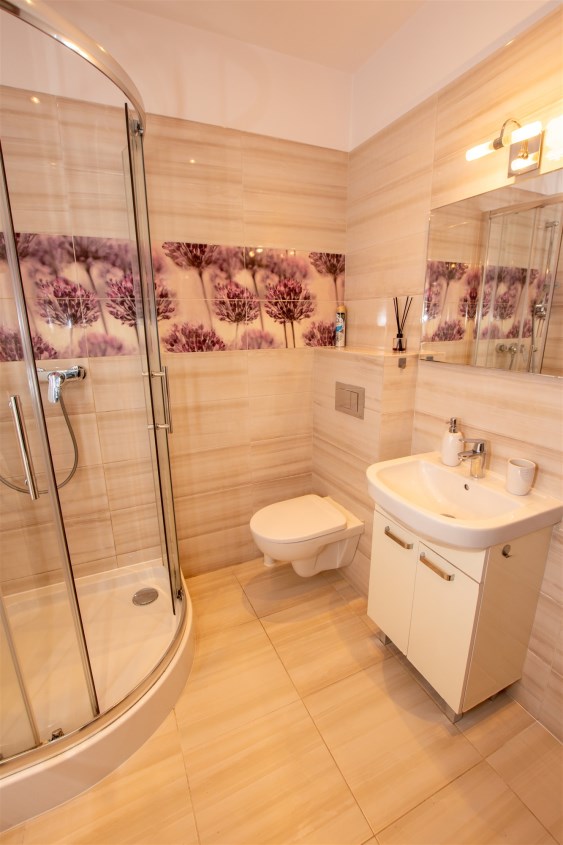 - duża łazienka - z pralką, dla fanów szybkich kąpieli - kabiną prysznicową, umywalką i wc.