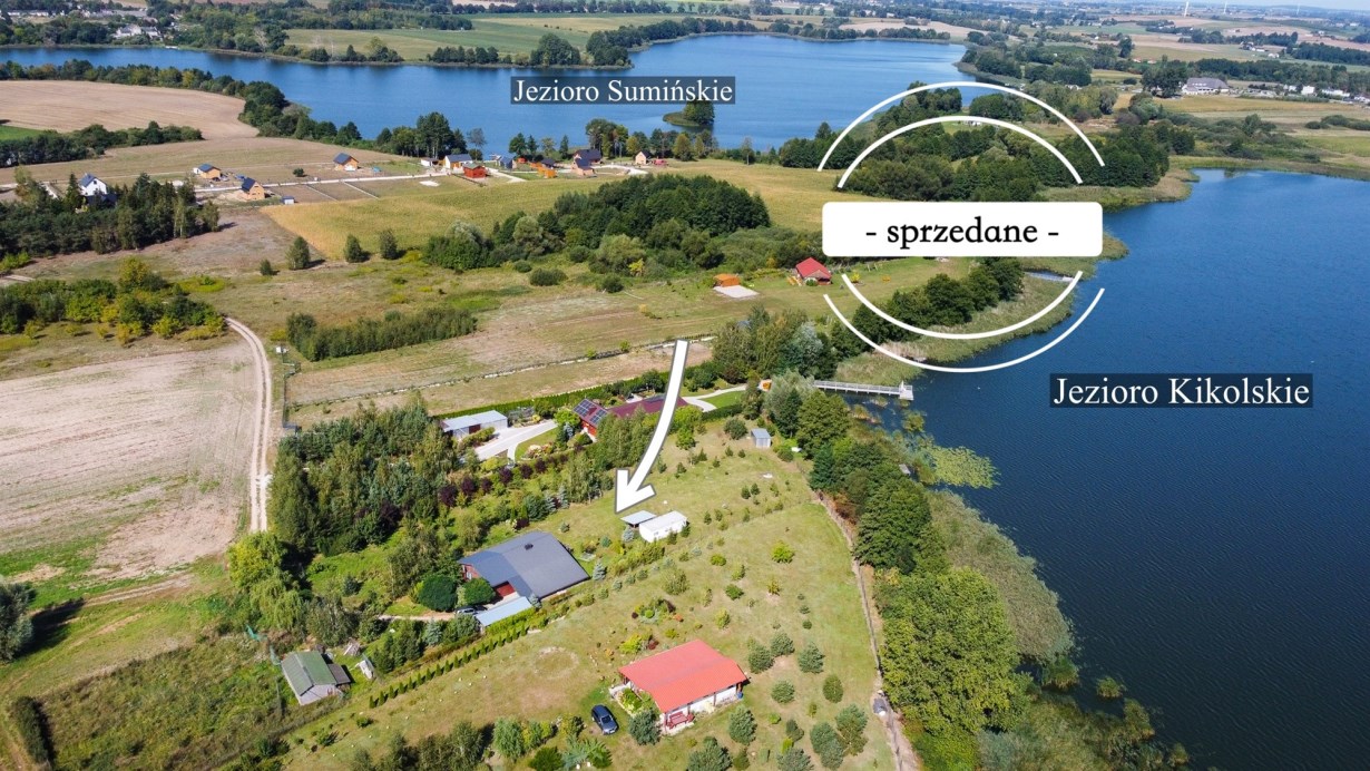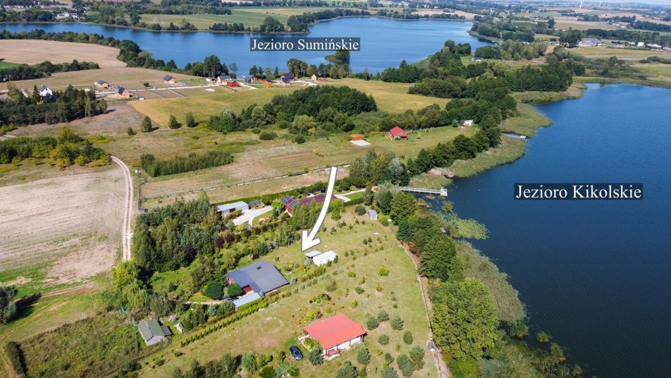 Działka położona jest u zbiegu dwóch jezior! Jak wcześniej wspomniałam, posiada bezpośredni dostęp do Jeziora Kikolskiego, natomiast od Jeziora Sumińskiego w linii prostej dzieli ją zaledwie 450 metrów odległości.