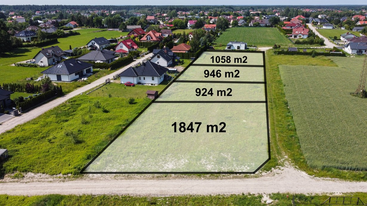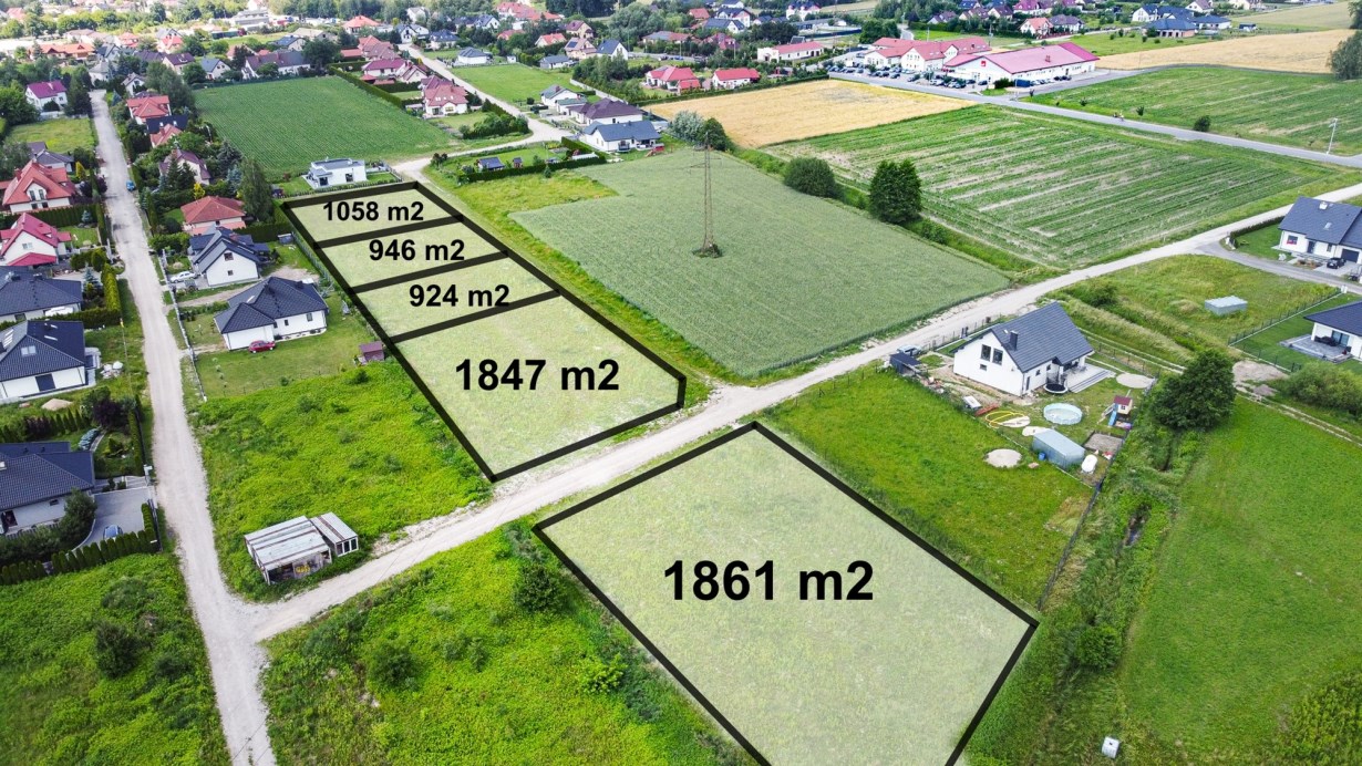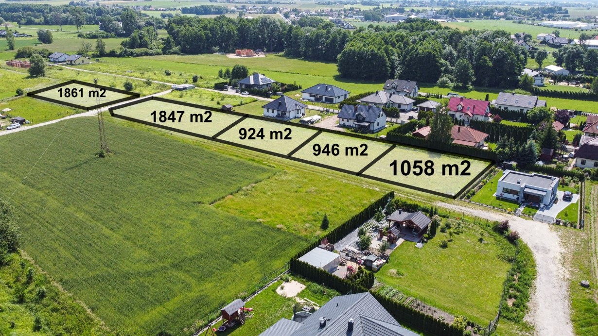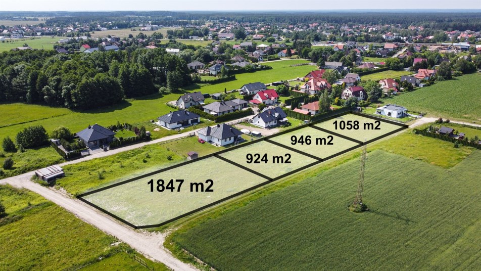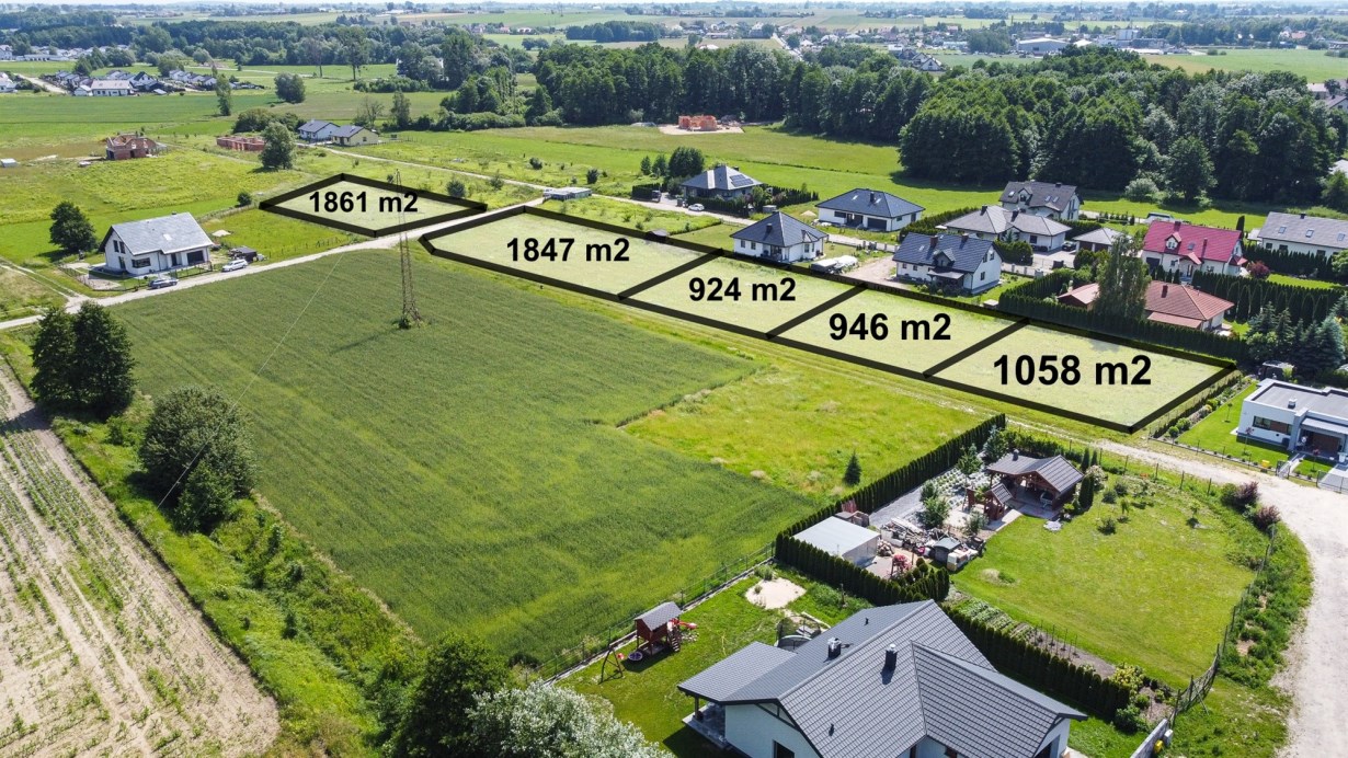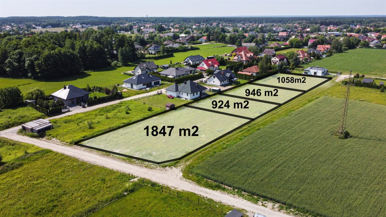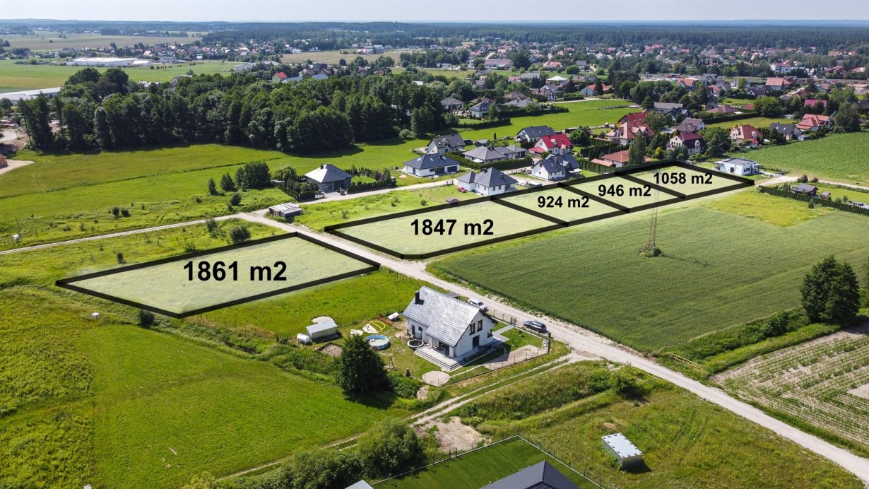 Działki w kształcie prostokąta, zlokalizowane przy utwardzonej drodze. Działki o płaskim kształcie, w sąsiedztwie zadbane i nowoczesne zabudowania domów jednorodzinnych.