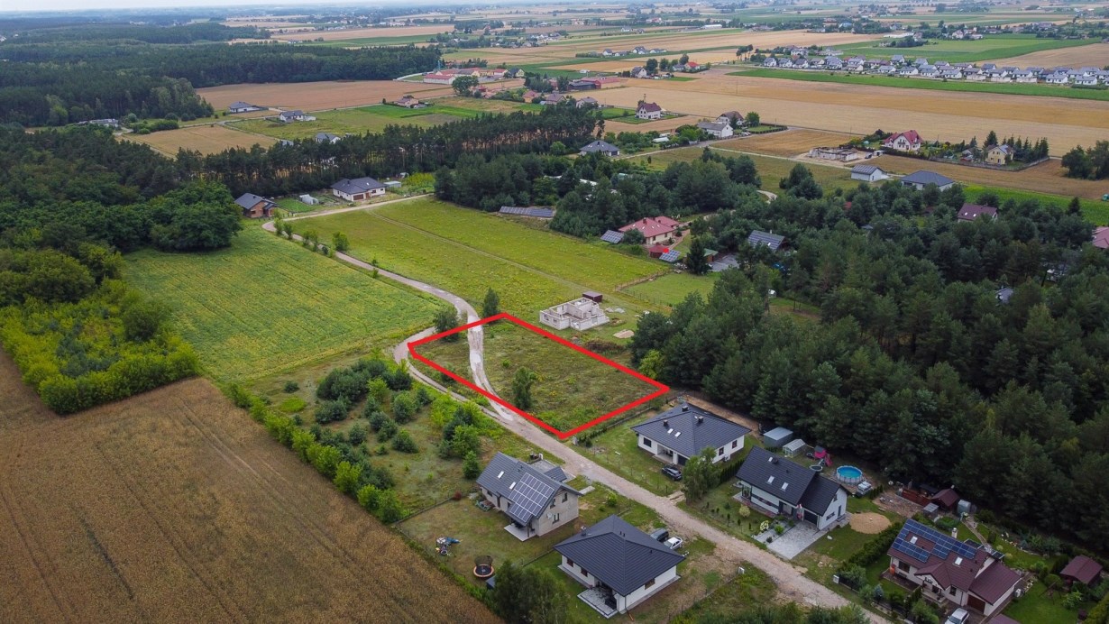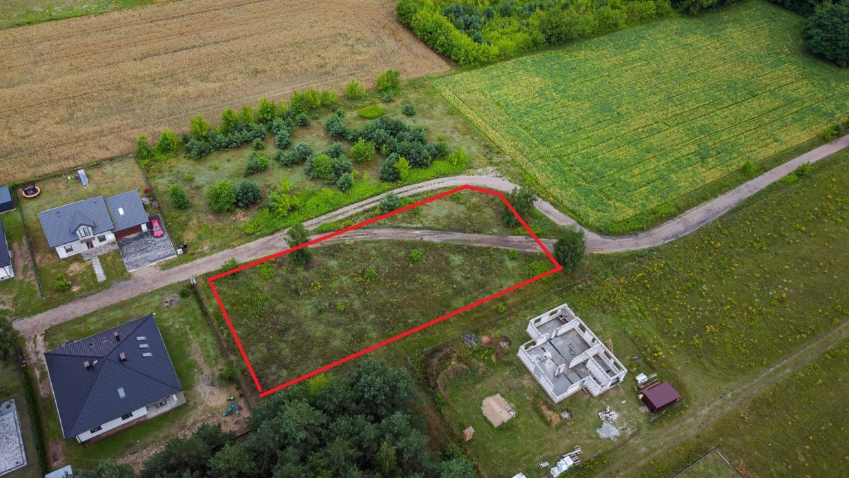 Teren o powierzchni 2078 m2 , w kształcie prostokąta. W najbliższym otoczeniu nowo powstające domy jednorodzinne. Przyjemna, zaciszna okolica, otoczona lasem i zaledwie kilkoma sąsiadami. Jednocześnie bardzo szybki dojazd do drogi asfaltowej ok 600 m.
