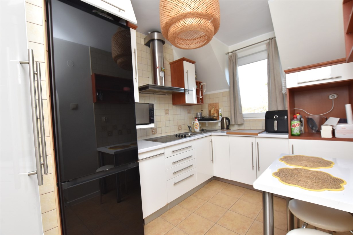 Na pierwszym poziome znajduje się jasny salon z wyjściem na balkon oraz kuchnia, która została wyposażona w zabudowę kuchenną wraz ze sprzętem AGD. Dodatkowo na tym poziomie znajduje się sypialnia oraz łazienka z wc.