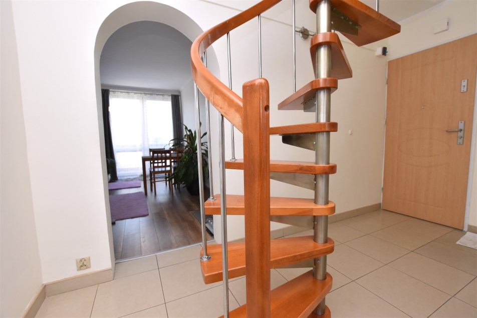 Na pierwszym poziome znajduje się jasny salon z wyjściem na balkon oraz kuchnia, która została wyposażona w zabudowę kuchenną wraz ze sprzętem AGD. Dodatkowo na tym poziomie znajduje się sypialnia oraz łazienka z wc.