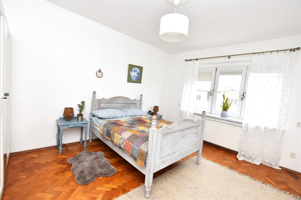 Pokoje i przedpokój podobnie jak salon posiadają gładzie oraz dębową podłogę.