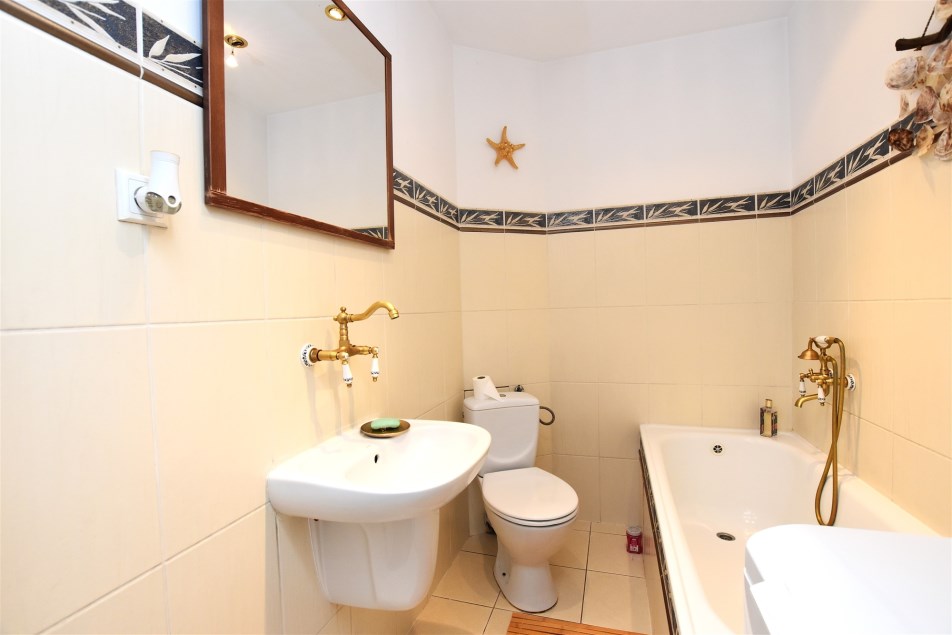 Łazienka klasycznie wykończona, wyposażona jest w wannę, wc, umywalkę z szafką oraz pralkę.