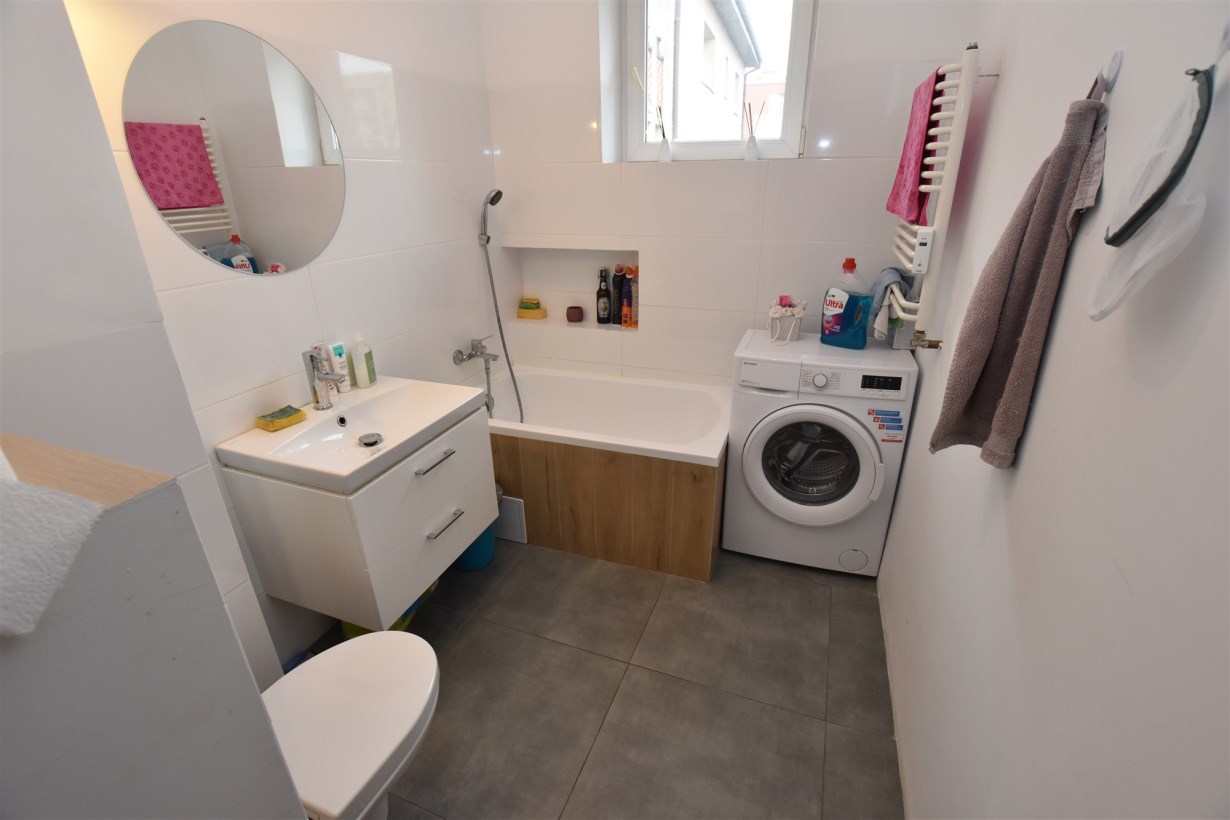 Łazienka - z oknem. Na podłodze i ścianach kafle, wyposażona w wannę. Osobne WC.
