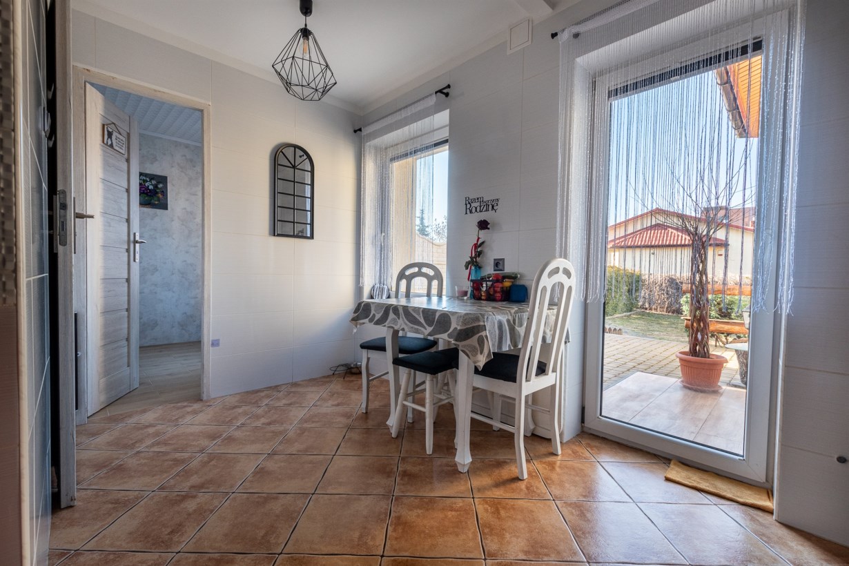 Na wprost wejścia kuchnia, z wyjściem na taras. Dalej na lewo łazienka z wc w nowoczesnej glazurze. Kolejne pomieszczenie to sypialnia i "schowek" - wyodrębniona powierzchnia na pralnię.