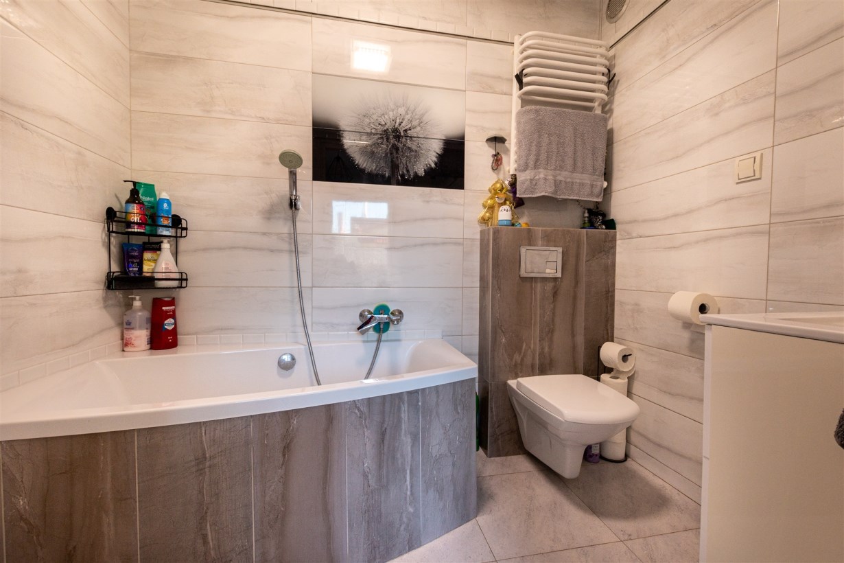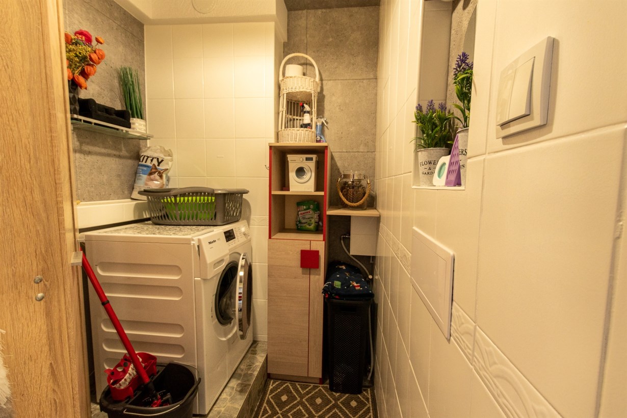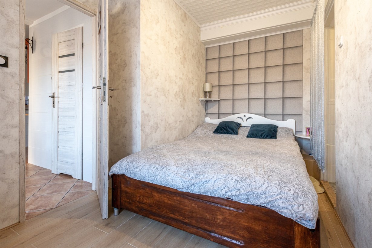 Mieszkanie jest dwupoziomowe i składa się z 3 pokoi, kuchni, łazienki z wc, wiatrołapu, schowka; który w tym momencie pełni funkcję pralni.