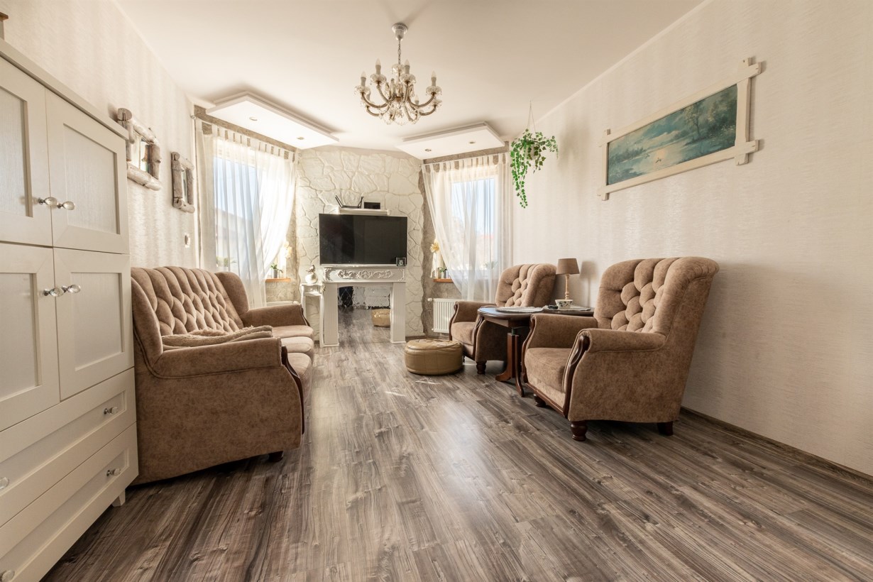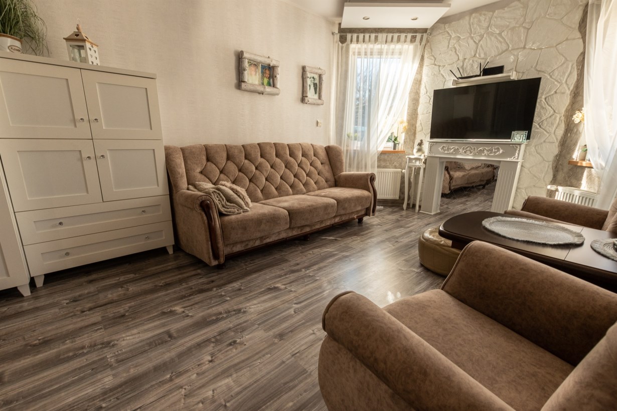 Wejście do mieszkania znajduje się w nowo dobudowanej części, po wejściu znajdujemy się w przestronnym holu z duża szafą w zabudowie. Na prawo 17,25m2 bardzo jasny pokój z oknami w stronę ogrodu.