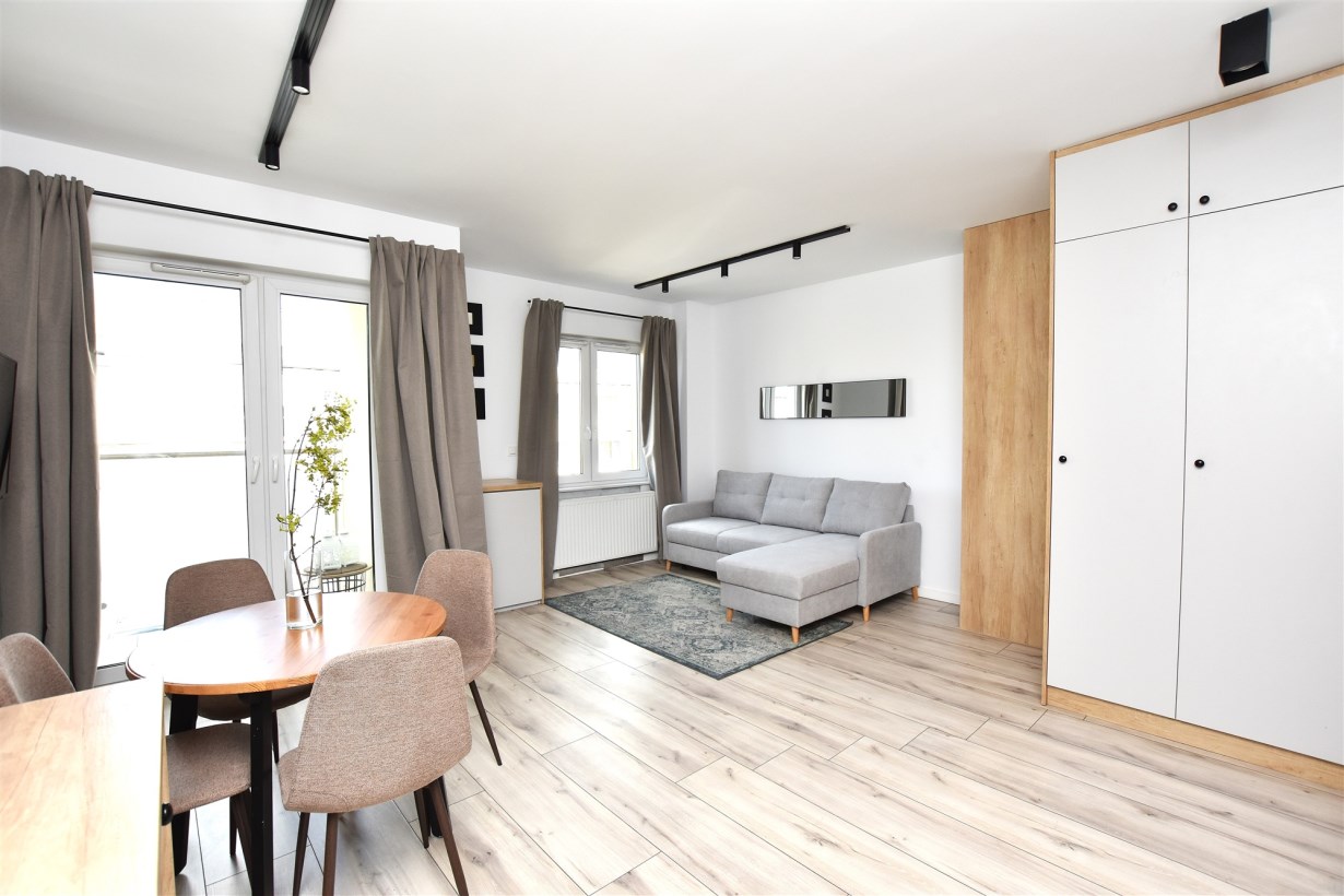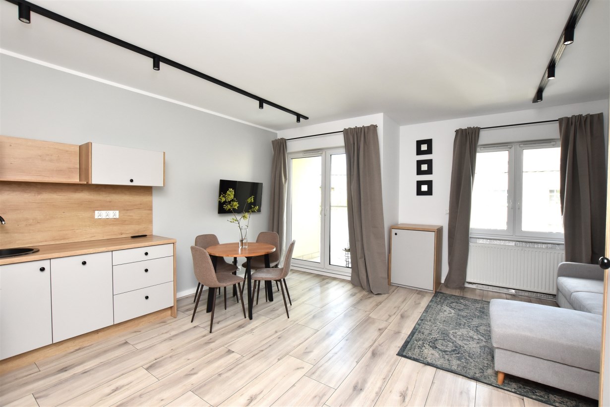 - salon z aneksem kuchennym z wyjściem na balkon,