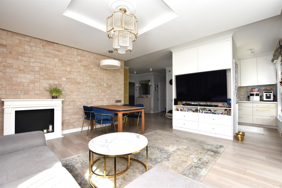 Apartament został wykończony z wysokiej jakości materiałów, zaprojektowany w stylu łączącym klasyczną elegancję z nowoczesnymi rozwiązaniami.