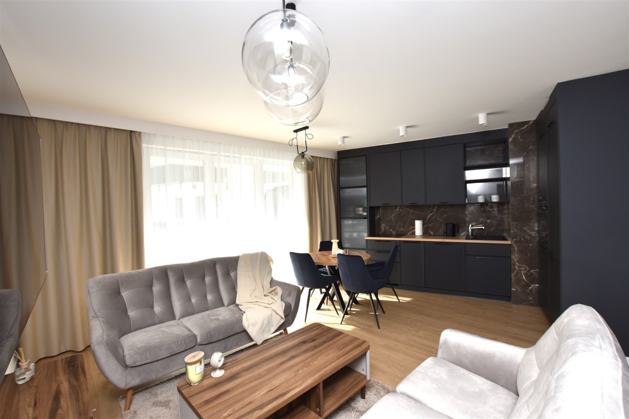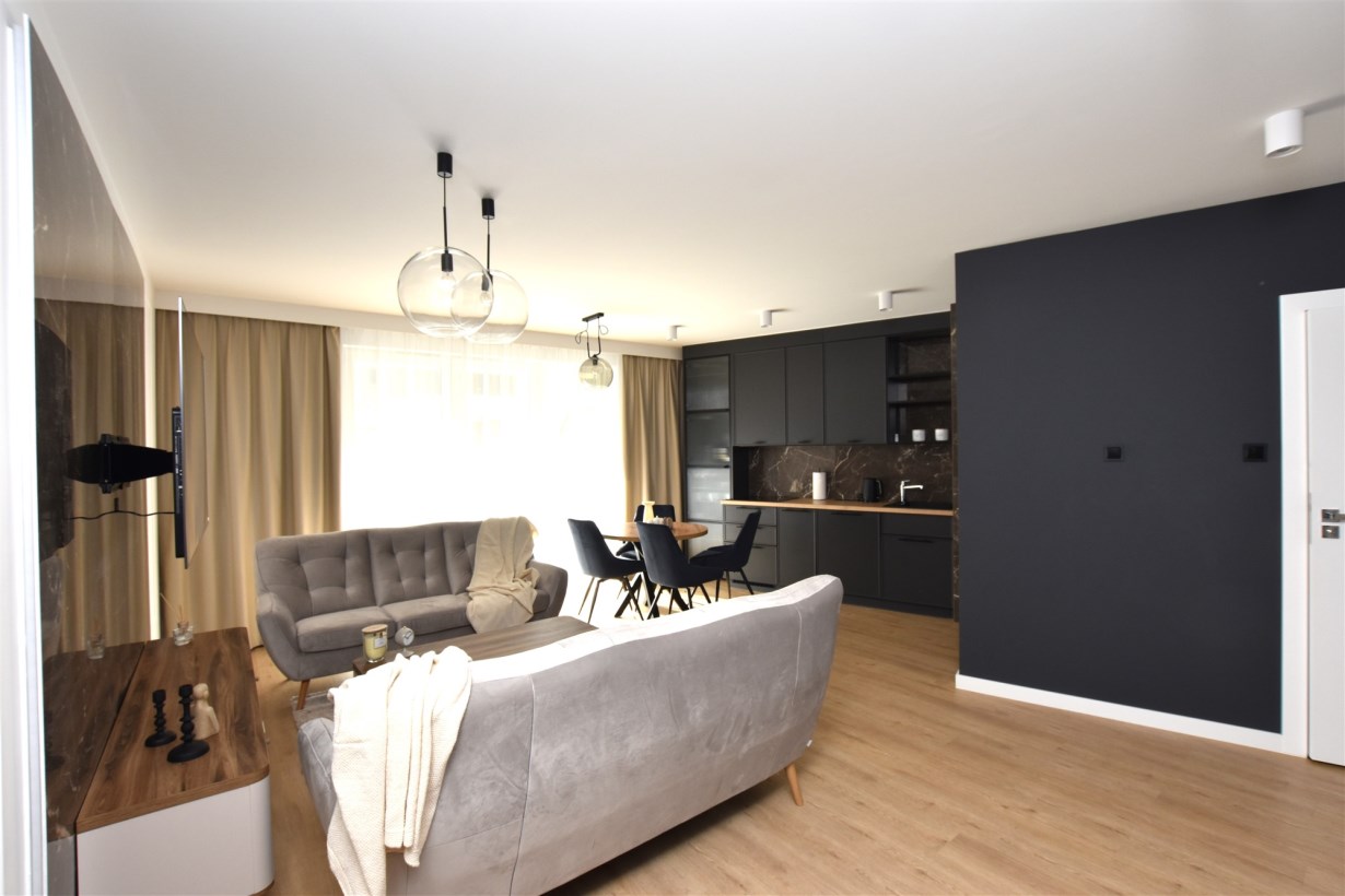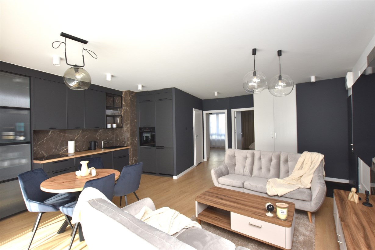 Mieszkanie zostało umeblowane w funkcjonalnym a zarazem eleganckim charakterze.