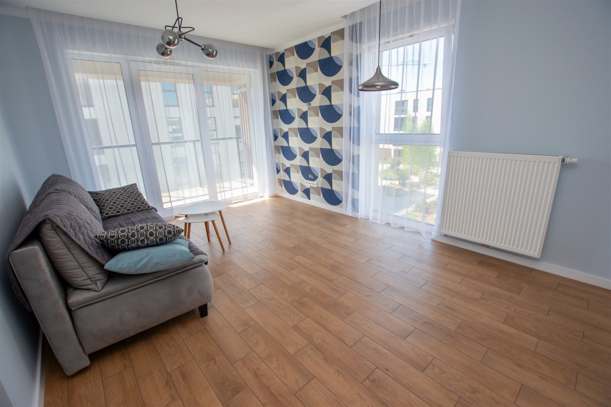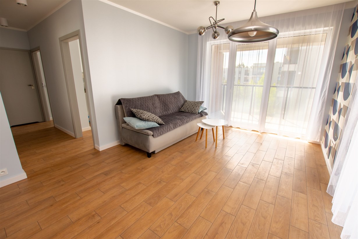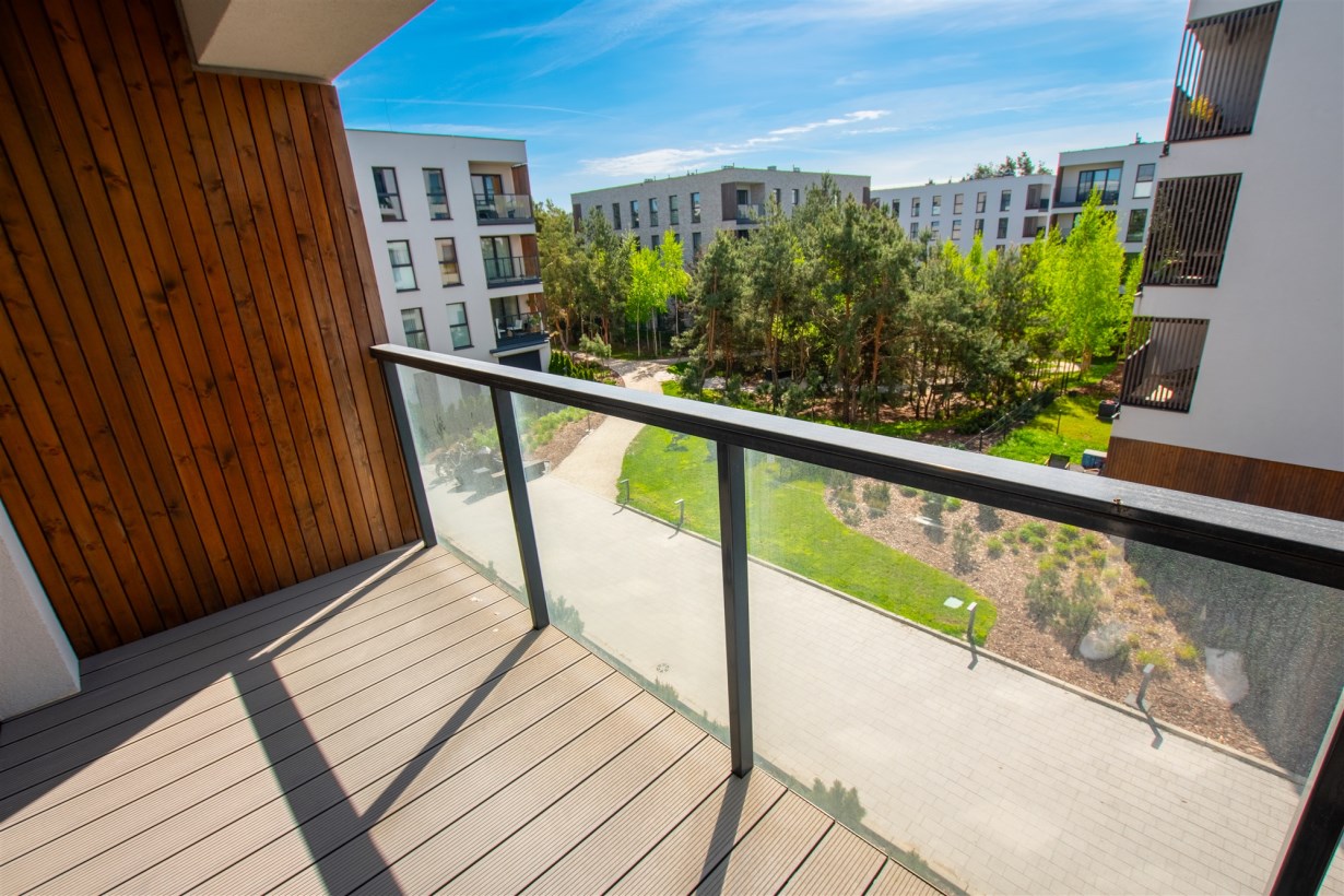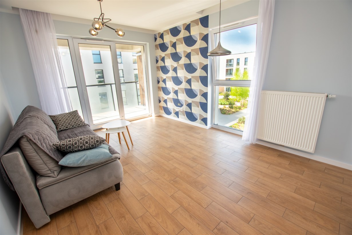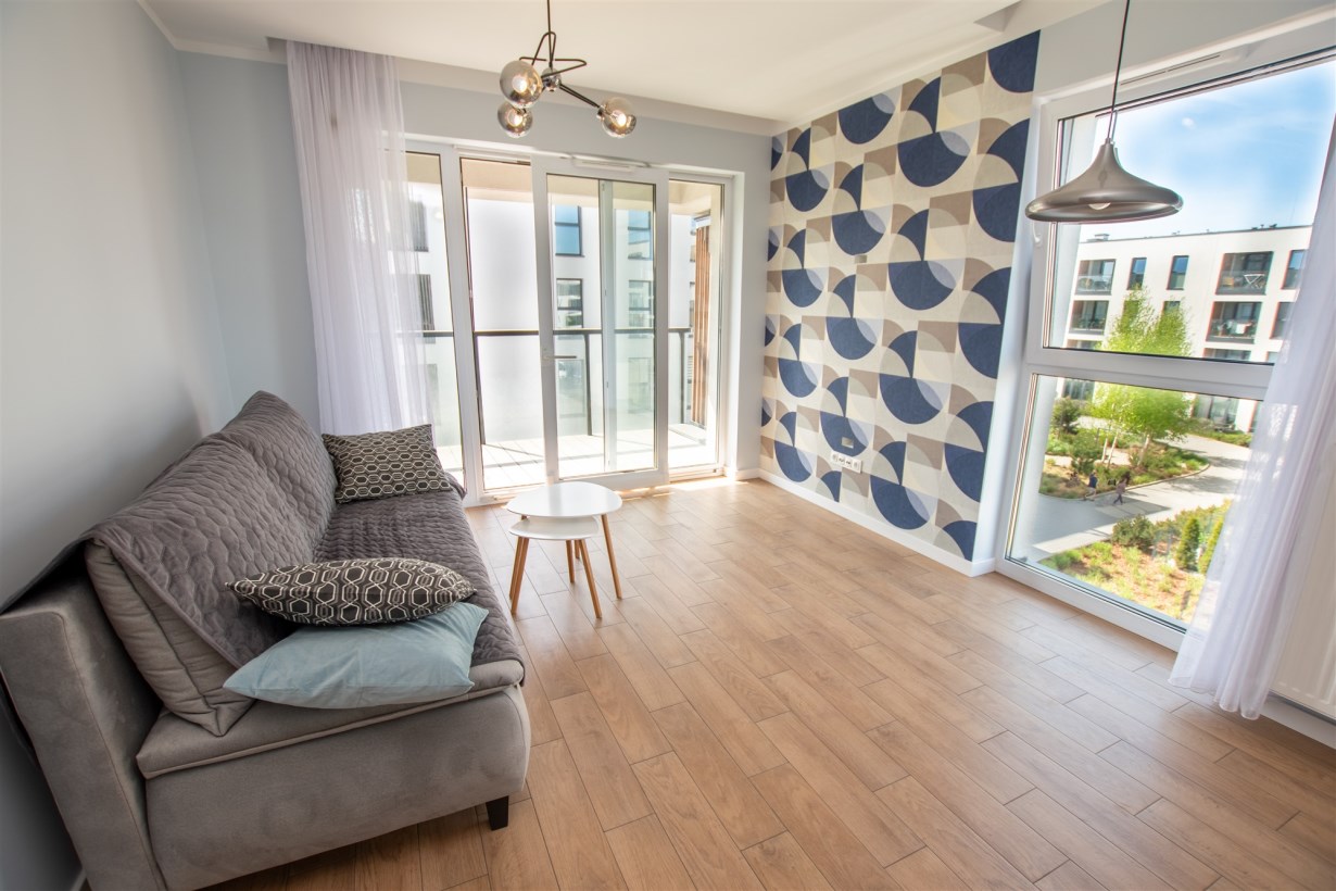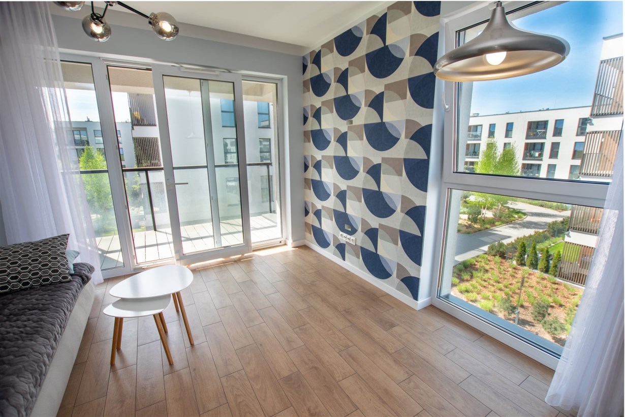 - dużego pokoju z wyjściem na balkon, z którego rozpościera się widok na zazieleniony skwerek, dużo okien w salonie i strony świata powodują, iż słońca w tym pomieszczeniu nie brakuje,
