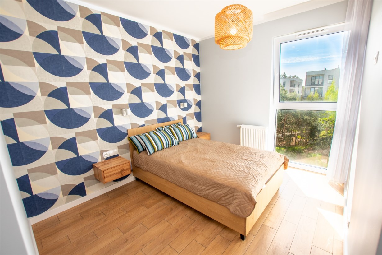 - sypialni z dużym oknem, na jednej ze ścian tapeta ozdobna, oprócz widocznego łóżka jest jeszcze miejsce na zabudowanie ściany szafą,