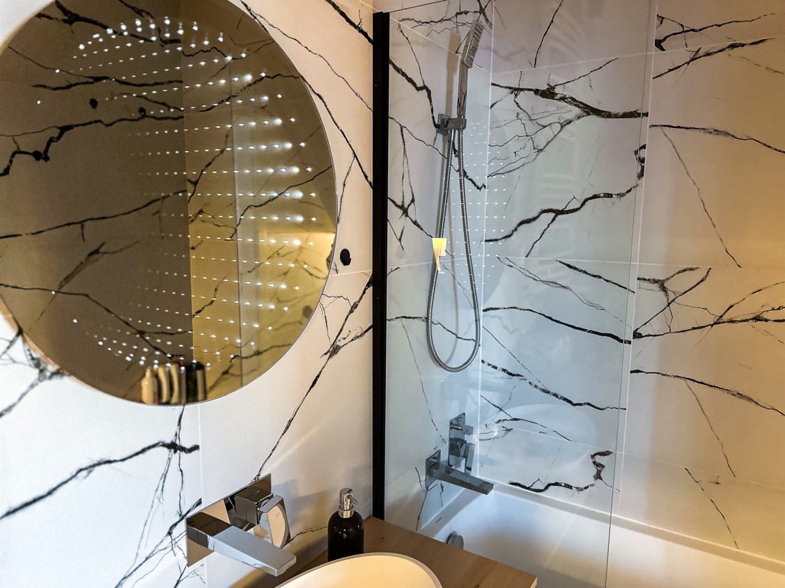 bardzo gustownie urządzona i funkcjonalna łazienka z wc wyposażona w wannę z funkcją prysznica.