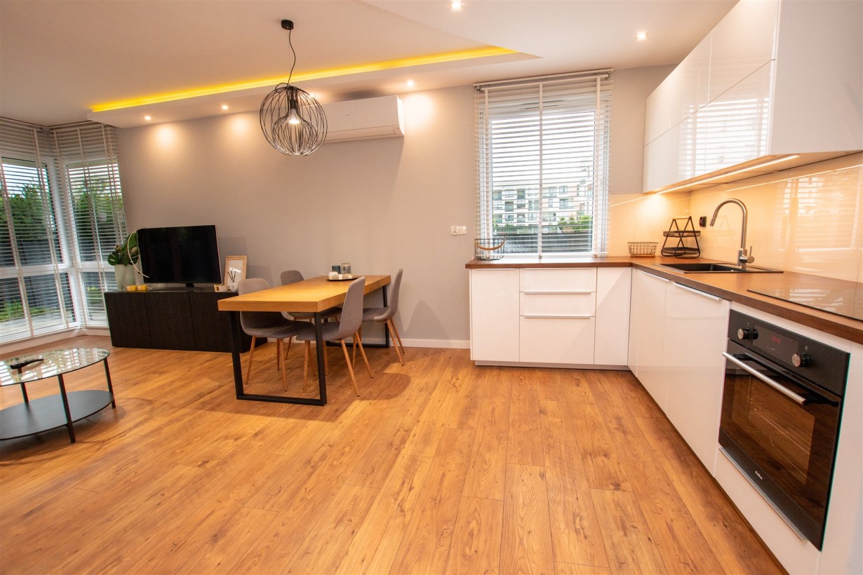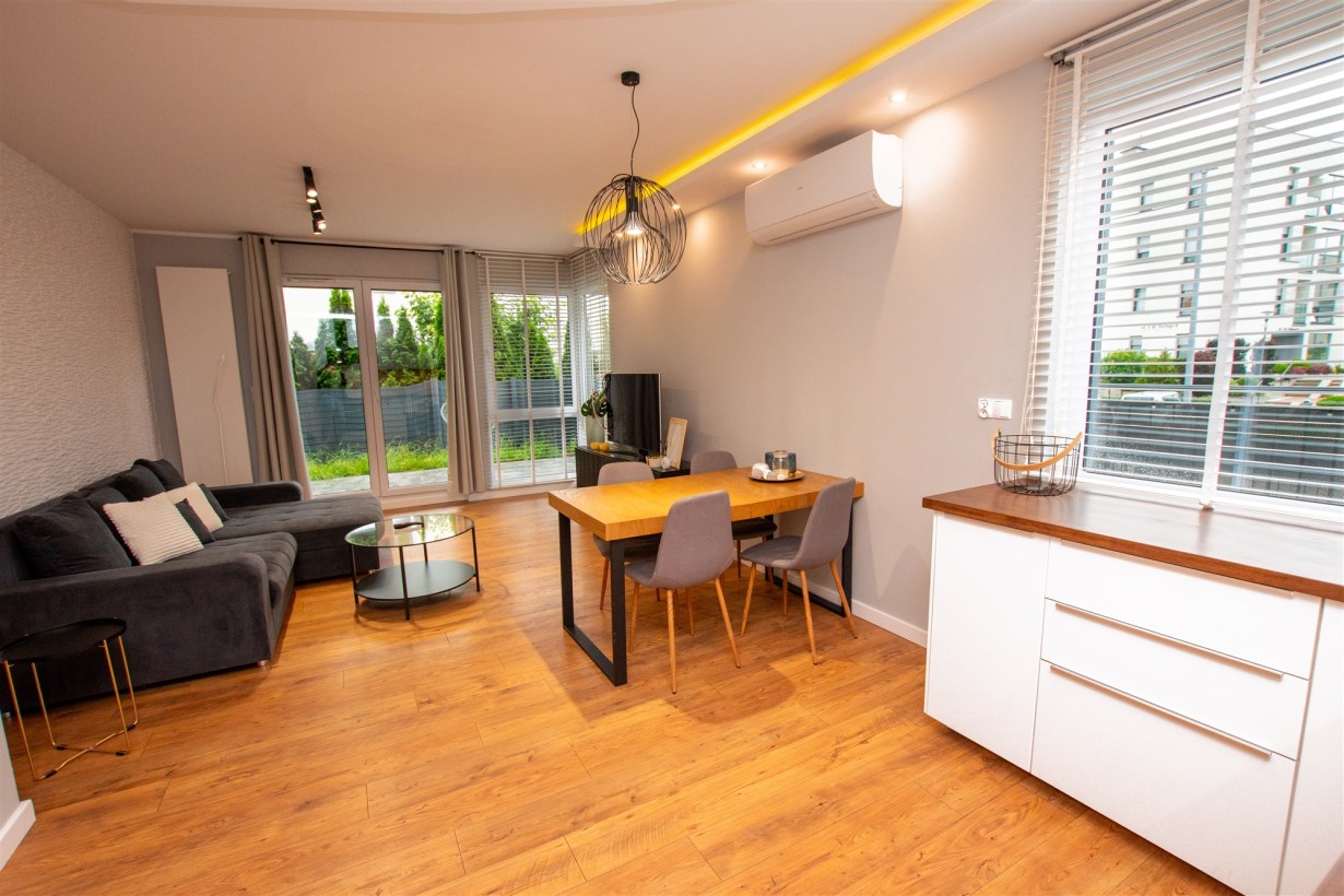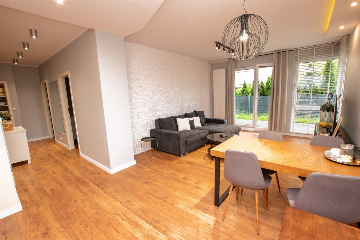 - salon połączony z aneksem kuchennym - dodatkowo z niego wyjście na taras z ogródkiem,