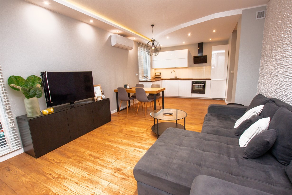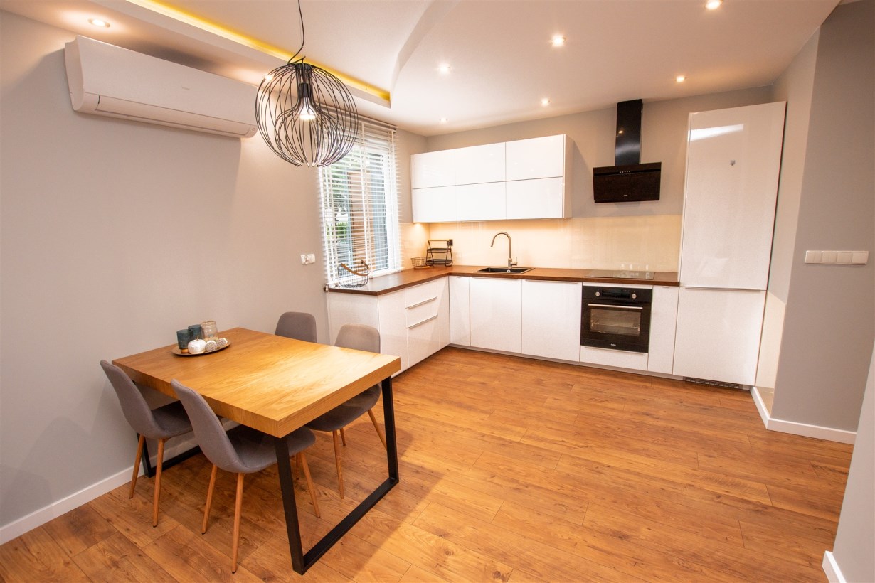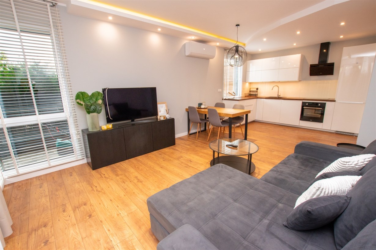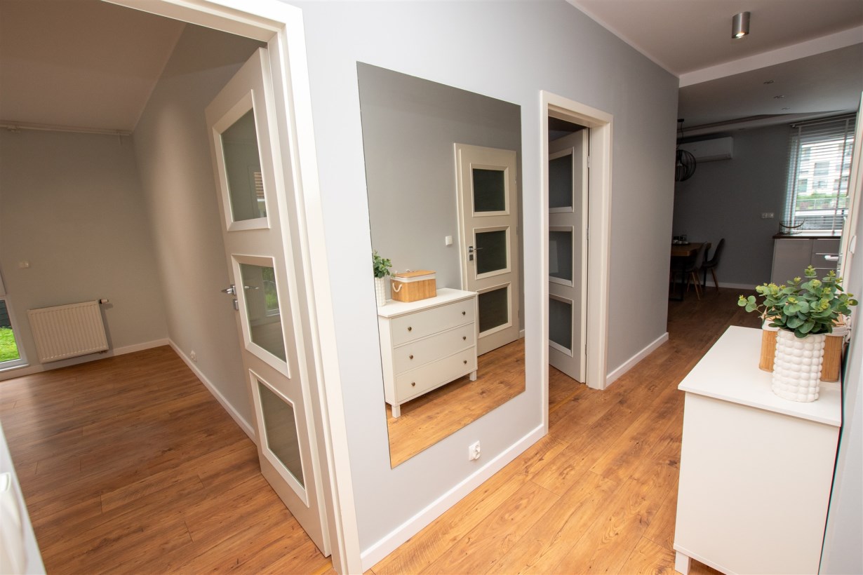 - salon połączony z aneksem kuchennym - dodatkowo z niego wyjście na taras z ogródkiem,