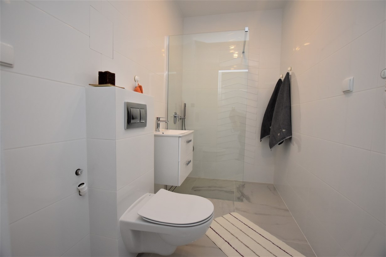Łazienka połączona z wc wyposażona została w armaturę, w tym kabinę prysznicową oraz sprzęt agd-pralkę.