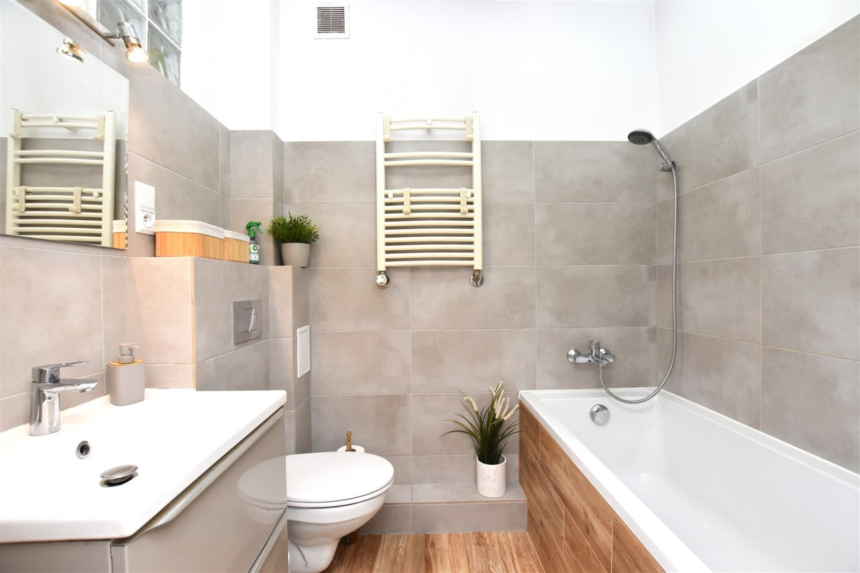 Łazienka wykończona w kaflach nowego typu, wyposażona jest w wannę, wc, umywalkę z szafką oraz pralkę.